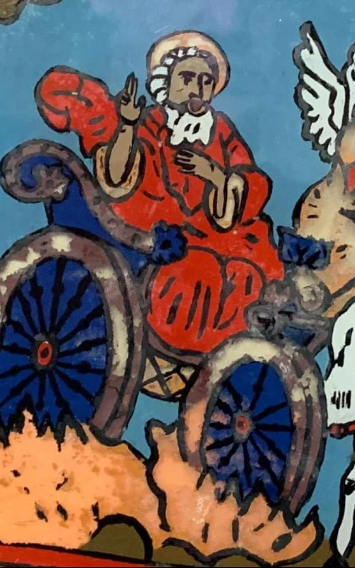 De remarcat că întregul cer al icoanei e cuprins de vâlvătăi lacome, devoratoare (văzduhul e portocaliu, are culoarea limbilor de foc ce se ridică de sub armăsar).