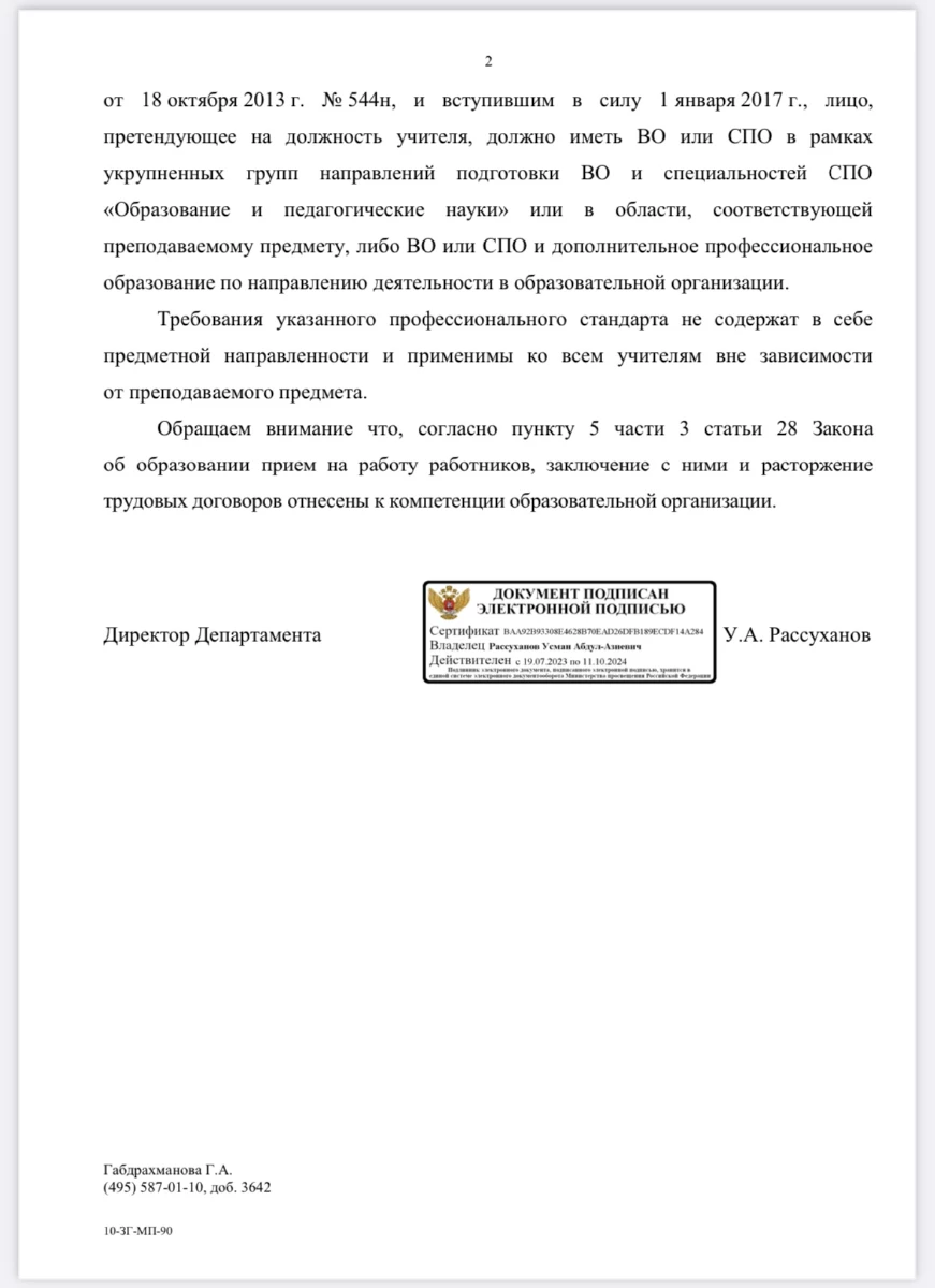 În conformitate cu cerințele privind educația și formarea profesională stabilite de standardul profesional „Pedagog (activitate pedagogică în domeniul învățământului preșcolar, învățământului primar general, învățământului general de bază, învățământului secundar general), (educator, profesor)", aprobat prin Ordinul nr. 544n al Ministerului Muncii din Rusia din 18 octombrie 2013 și în vigoare de la 1 ianuarie 2017, o persoană care candidează pentru postul de profesor trebuie să aibă o diplomă de studii superioare sau o calificare de studii medii profesionale în următoarele domenii sau grupe lărgite de domenii de formare din cadrul învățământului superior și specialități din cadrul studiilor medii profesionale - „Științe ale educației și științe pedagogice” sau într-un domeniu care corespunde disciplinei predate, sau un candidat la postul de profesor trebuie să aibă o diplomă de studii superioare sau atestat de studii medii de specialitate și o formare profesională suplimentară în domeniul ”Educație și științe pedagogice”.