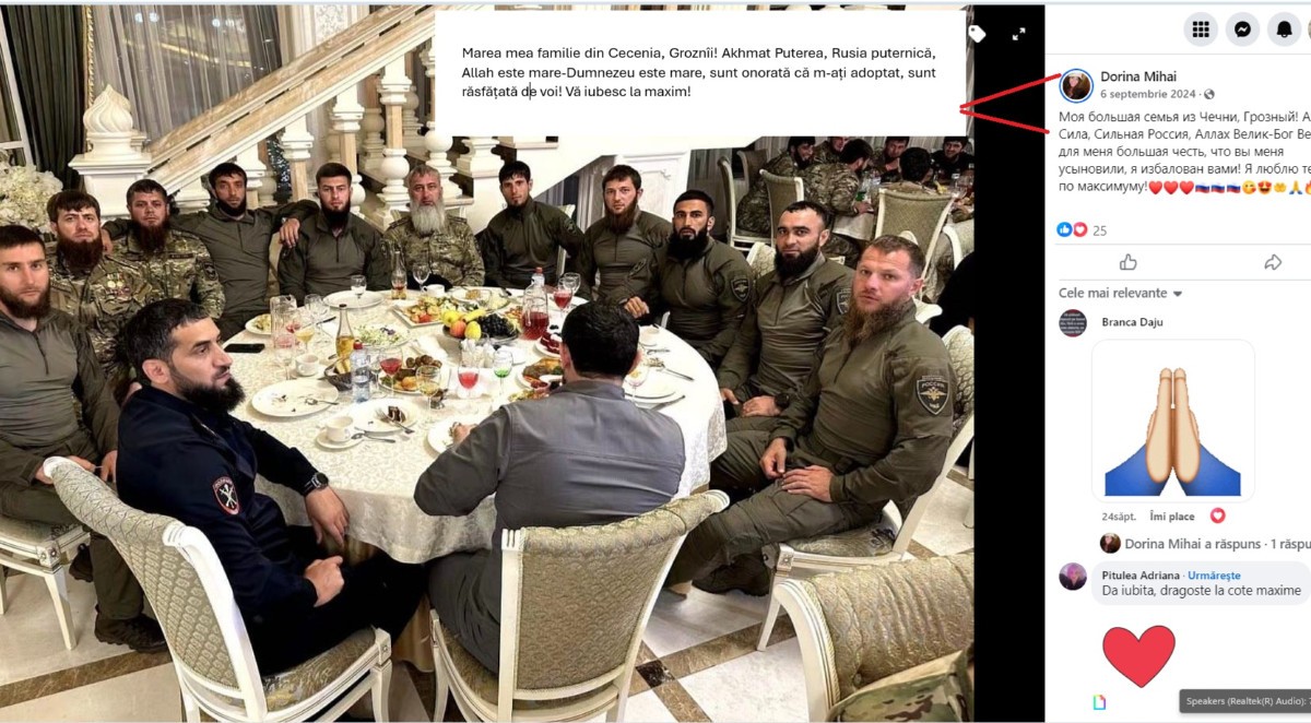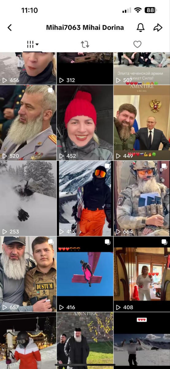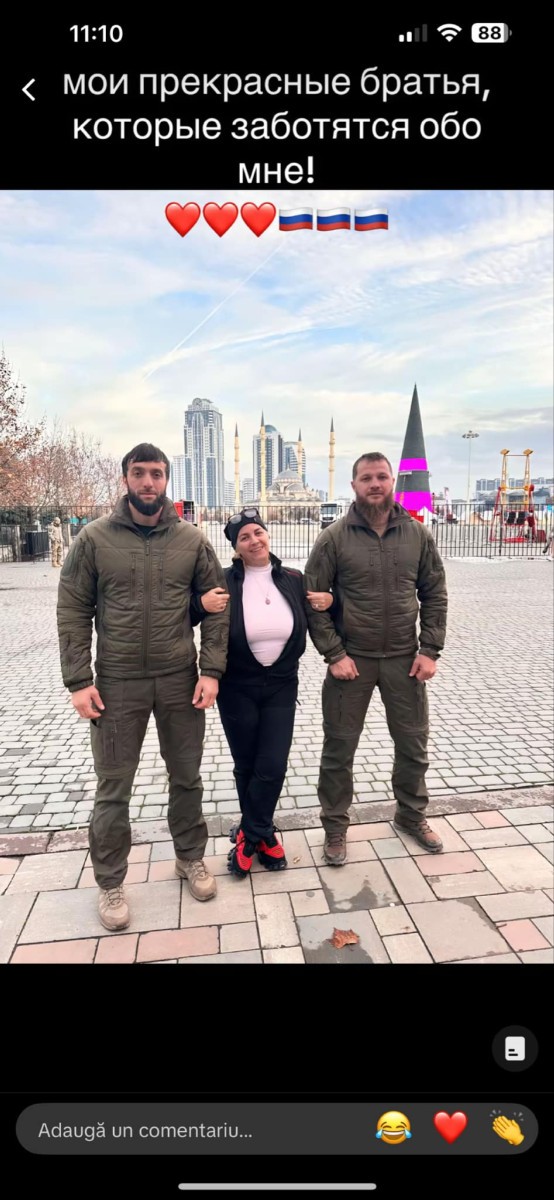 Mai jos, capturi de pe TIk Tok cu presupusa parteneră de afaceri a „Lunetistului” (la unele dintre imagini cu grupuri numeroase de ceceni, femeia scrie direct în rusă: familia mea mare și iubită din Cecenia)