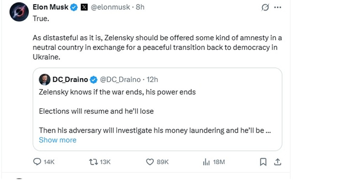 „Oricât de neplăcut ar fi, lui Zelenski ar trebui să i se ofere un soi de amnistie într-o țară neutră în schimbul unei tranziții pașnice către democrație în Ucraina”, scrie și Elon Musk într-o postare pe X.
