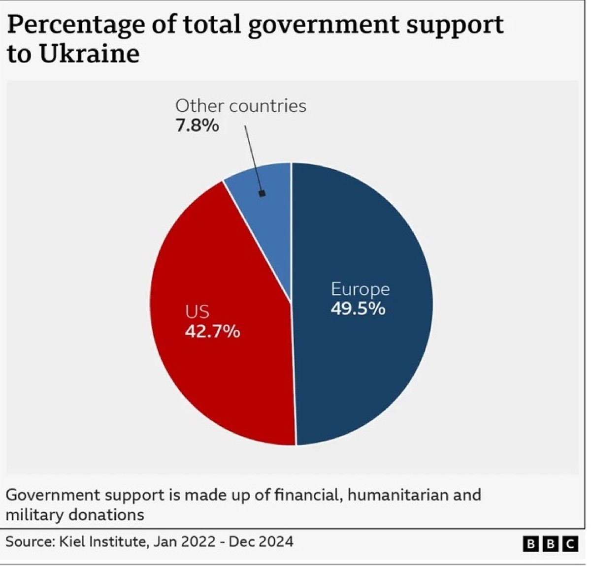 Statele Unite sunt, într-o oarecare măsură, cel mai mare donator individual pentru Ucraina. Însă statele europene au cheltuit împreună mai mulți bani decât Statele Unite, potrivit Institutului Kiel.