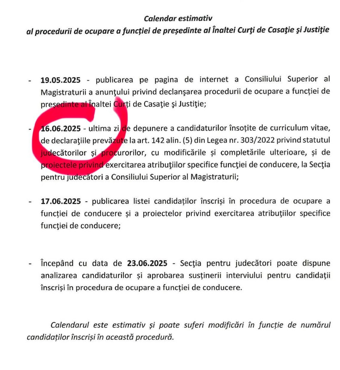 „Președinta Consiliului Superior al Magistraturii, judecătoarea Elena Raluca Costache, a încălcat grosolan Legea nr. 303 din 15 noiembrie 2022 privind statutul judecătorilor și procurorilor. Magistrata a demarat în mare viteză procedura luni, 19 mai 2025, urmând ca aceasta să se încheie la sfârșitul lunii iunie. Decizia de a demara întreaga procedură nu este un act administrativ în sensul legii și, prin urmare, nu a putut fi contestată în instanță pentru a fi suspendată sau anulată.