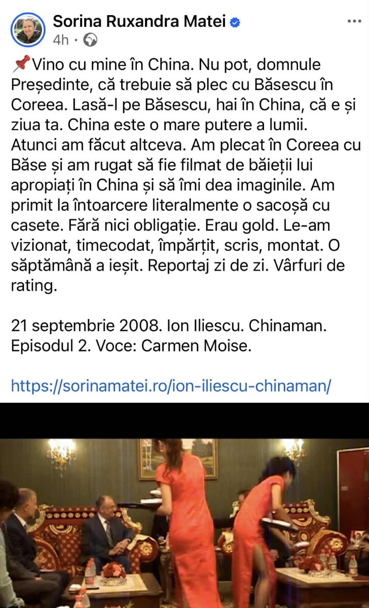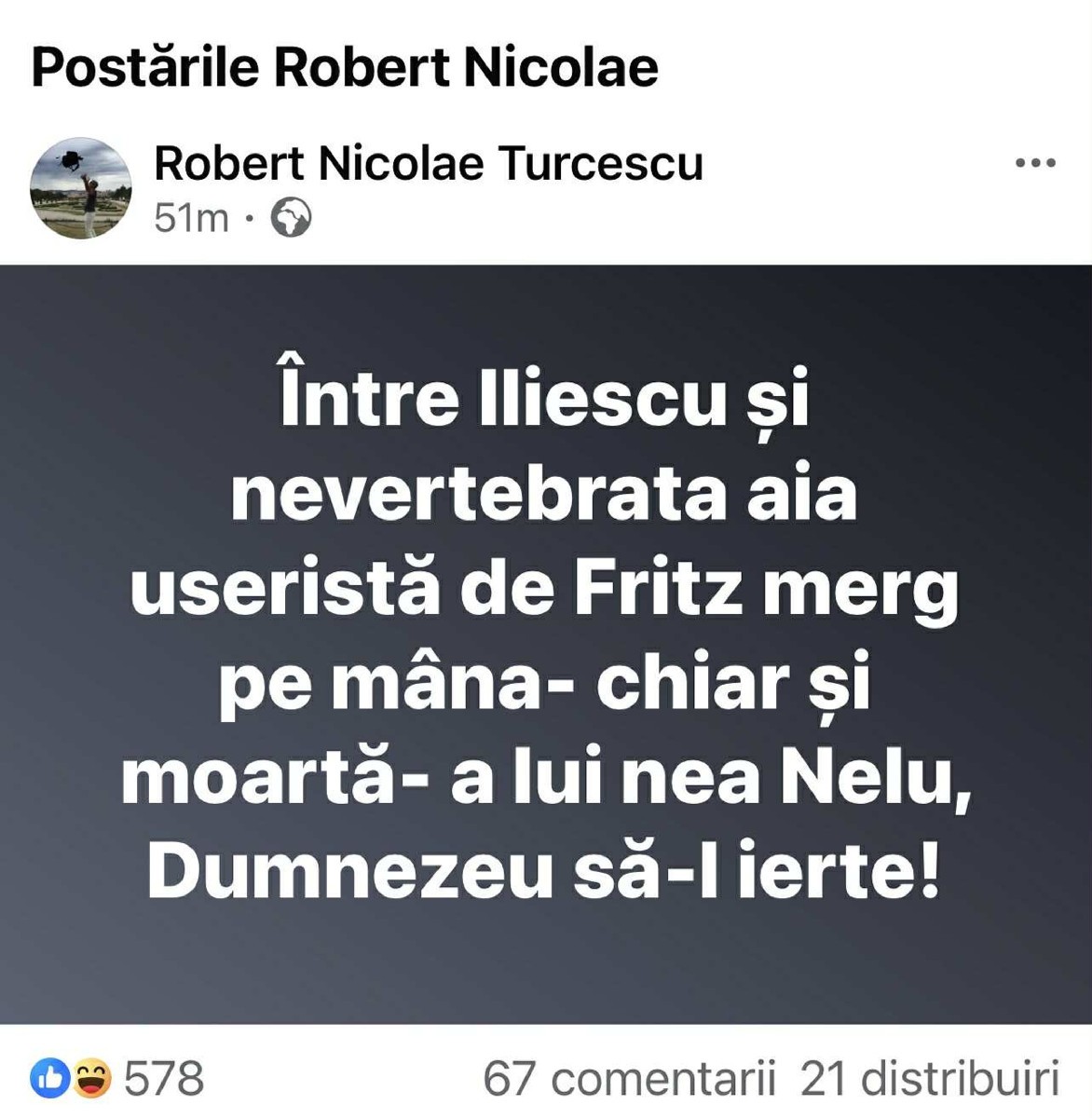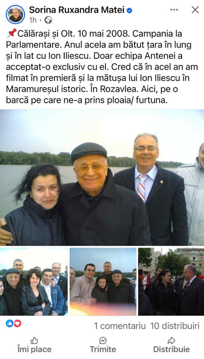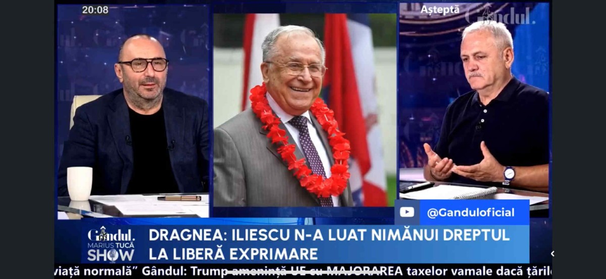 Menționăm și noi în acest context o parte din cortegiul mortuar care deplânge agresiv moartea lui Ion Iliescu, încercând să acrediteze ideea că acestui bolșevic cu sânge rece i-am datora intrarea în NATO și UE și multe alte realizări mărețe: Sorina Ruxandra Matei (angajată pe la Aleph News, o entitate media finanțată de Adrian Sârbu, acuzat în dosarul Mineriadei de infracțiuni imprescriptibile (contra umanității), Marius Tucă, fostul angajat al securistului Dan Voiculescu, Gândul, publicație deținută de Radu Budeanu, condamnat la închisoare cu suspendare după o înțelegere cu DNA în dosarul mitei de 3,8 milioane de dolari pentru Elena Udrea (din partea afaceristului multimilionar trăitor prin Elveția Bogdan Buzăianu pentru a păstra o serie de contracte păguboase cu Hidroelectrica), Robert Turcescu, angajat la Metropola TV, televiziunea primarului Florentin Pandele, soțul Gabrielei Firea.