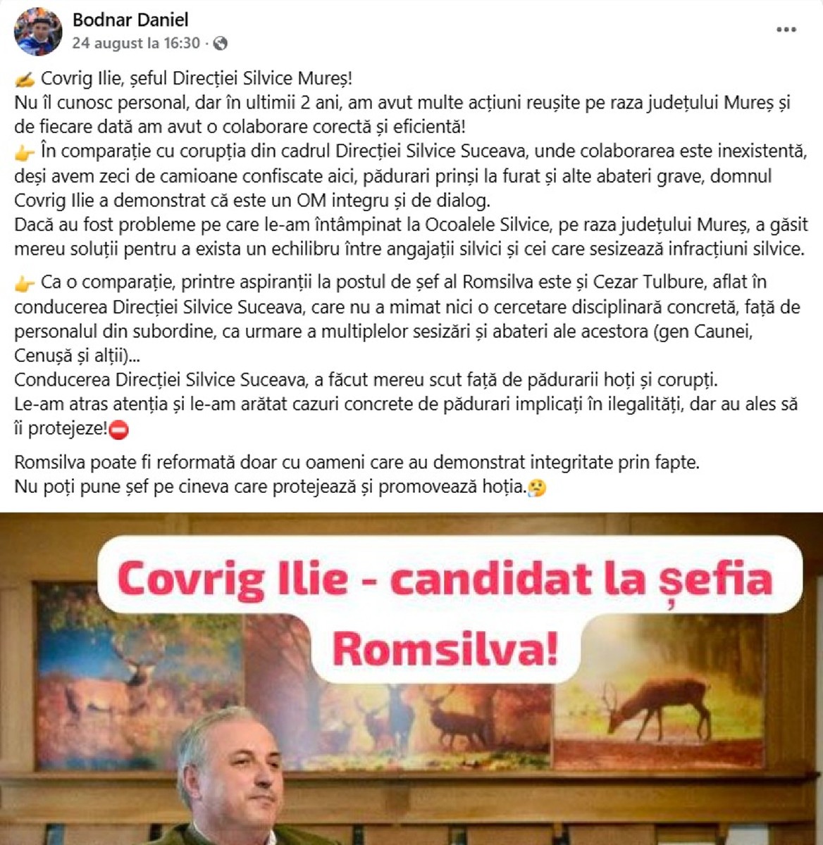 Activiștii de mediul (printre care Mihai Goțiu și Daniel Bodnar) l-ar fi vrut pe Ilie Covrig, șeful Direcției Silvice Mureș, considerat (inclusiv în reportajele și anchetele Recorder) drept un silvicultor curajos, printre primii din interior care a avut curaj să vorbească public despre tăieri ilegale și șpăgi, despre cârdășii și uriașa corupție din sistem. VIDEO la finalul textului!