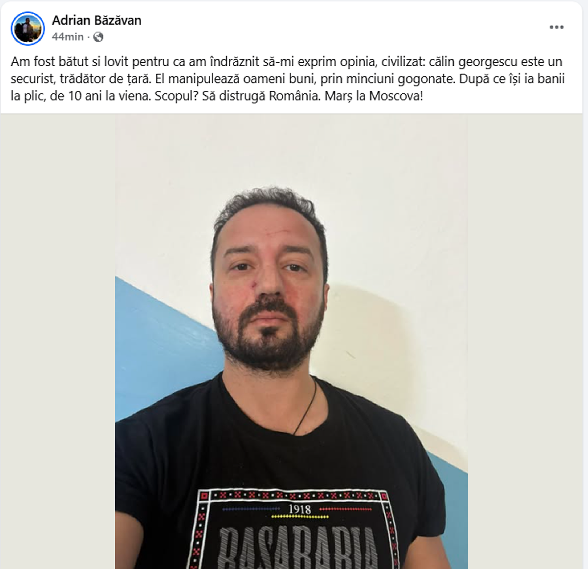 LATER EDIT! Ulterior într-o postare pe pagina sa de Facebook, contestatarul precizează că a fost bătut: „Am fost bătut si lovit pentru ca am îndrăznit să-mi exprim opinia, civilizat: călin georgescu este un securist, trădător de țară. El manipulează oameni buni, prin minciuni gogonate. După ce își ia banii la plic, de 10 ani la Viena. Scopul? Să distrugă România. Marș la Moscova!”