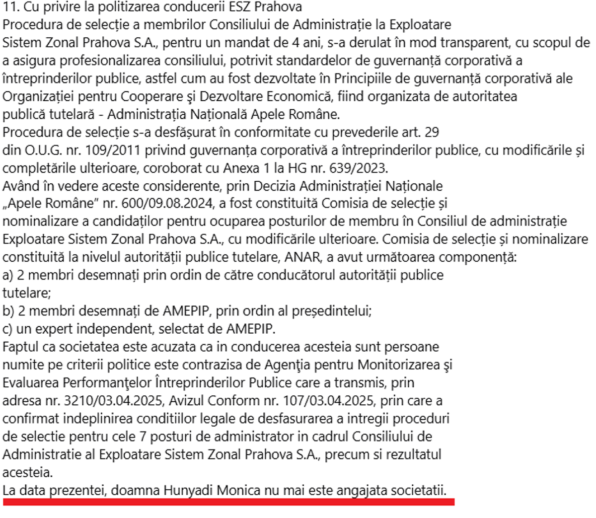 În acelați comunicat ESZ mai spune că Monica Hunyadi „nu mai este angajata societății la data prezentei” (fără a preciza însă de la ce dată nu mai este „angajată”, dar publicând, în schimb, o întreagă poliloghie despre cât de corectă, legală și transparentă a fost „procedura de selecție a membrilor Consiliului de Administrație la Exploatare Sistem Zonal Prahova S.A” - detalii mai jos).