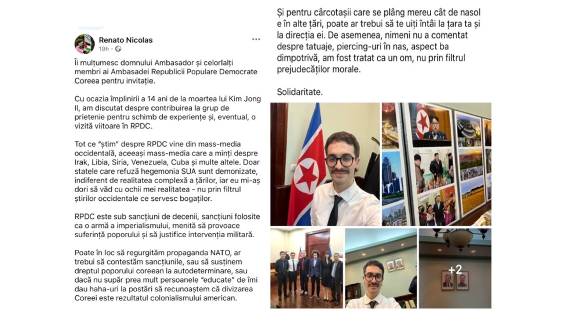 În aceeași postare, Renato Nicolas afirmă că percepția negativă din România asupra Coreei de Nord, precum și asupra altor state precum Cuba, Venezuela, Libia sau Irak, ar fi rezultatul „propagandei occidentale și imperialiste”. De asemenea, el acuză Statele Unite ale Americii de tentativa de impunere a unei hegemonii globale. În mediul online, Nicolas promovează un conținut eminamente marxist, care include critici la adresa NATO și a capitalismului, susținerea maoismului chinez și recomandări de literatură marxistă și comunistă.