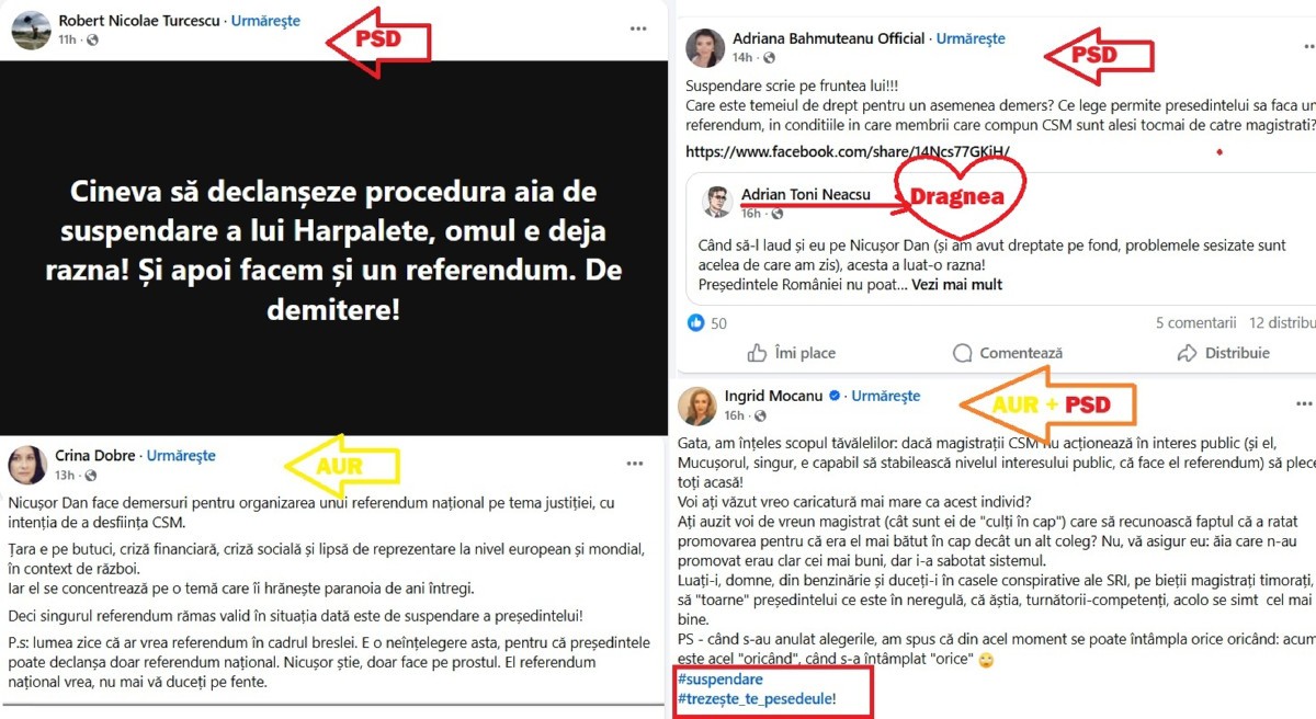Au mai îndemnat la suspendare Robert Turcescu, angajat la Metropola Voluntari TV, post de televiziune finanțat de Primăria lui Florentin Pandele, dar uneori și de CJ Ilfov condus de controversatul liberal Humbert Thuma, Adriana Bahmuțeanu, fostul iepure electoral al PSD la alegerile pentru Primăria Sectorului 1 din 2020 și Crina Dobre, fosta consilieră a impostorului politic Rareș Bogdan devenită apoi consilieră AUR la Camera Deputaților (despre ea, publicația Newsweek a scris recent că este plătită cu 7000 de lei pe lună și că înjură jurnaliști chiar în timpul programului. Detalii AICI.