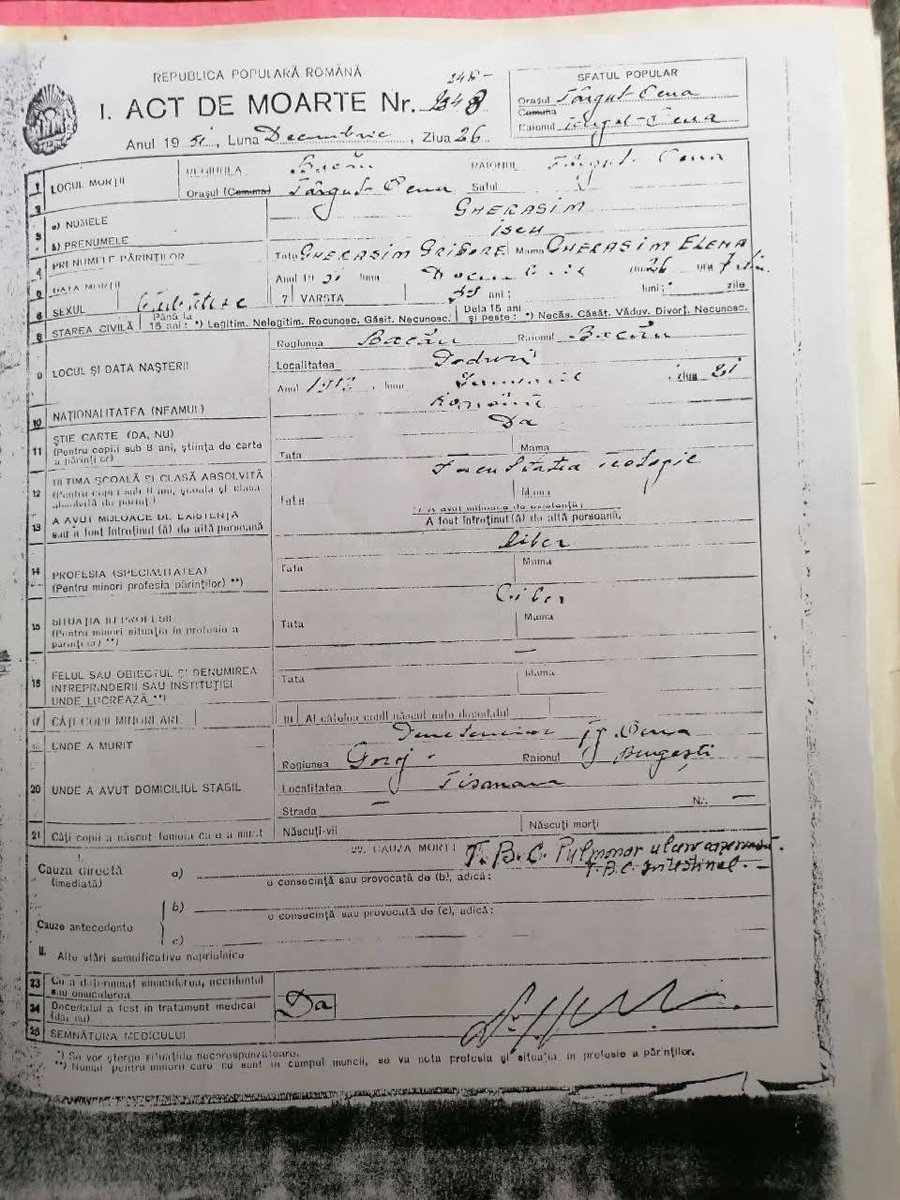 Născut la 21 ianuarie 1912 în comuna Poduri (jud. Bacău), Sfântul Cuvios Mucenic Gherasim a devenit frate de mănăstire la 12 ani la Mănăstirea Bogdana din același județ. Ulterior, s-a călugărit la Mănăstirea Tismana, fiind șef de promoție în 1935 al Seminarului de la Cernica (după o perioadă în care a fost elev al Liceului "Ferdinand" din Bacău). Pentru vrednicia sa, a fost numit stareț al Mănăstirii Arnota, devenind apoi bibliotecar-contabil al Seminarului de la Cernica. Între 1942-1944 a fost preot misionar în Transnistria.