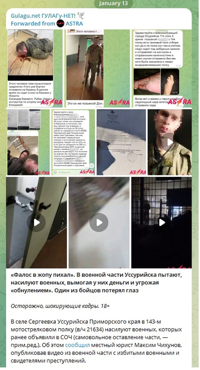 Potrivit rapoartelor consultate de Ostorozhno Novosti și de avocatul Maxim Chikhunov, comandanții unității militare 21634 (Ussuriisk, Divizia 143 de infanterie motorizată) i-ar fi închis pe soldații care au părăsit unitatea fără permisiune în „cuști” improvizate și i-ar fi supus repetat abuzurilor sexuale cu jucării erotice pentru a-i forța să-și predea salariile.