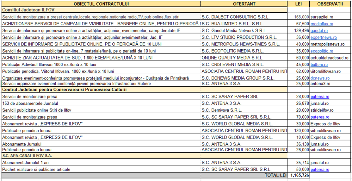 Sume importante de bani de duc de la CJ Ilfov și către alte entități media ultradubioase, unele susținătoare virulente ale AUR și Călin Georgescu precum Gândul (care a aspirat, în ultima vreme, toate trompetele anti-justiție din epoca lui Liviu Dragnea), altele fără pic de vizibilitate și audiențe cum ar fi „Adevăul Ilfovean” sau „Viitorul Ilfovean”.