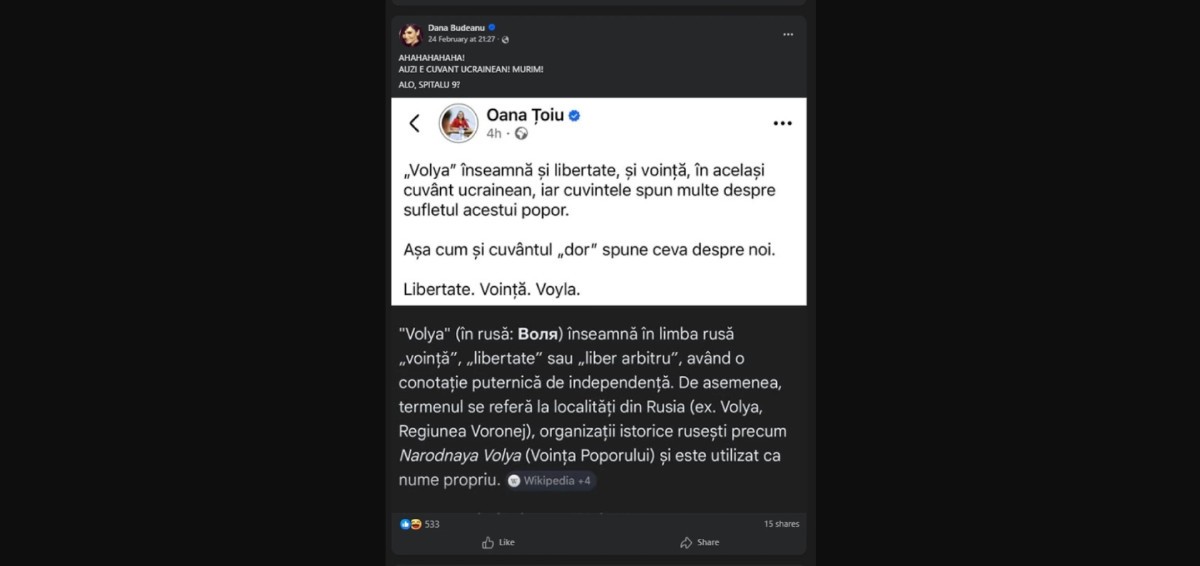 Mai exact, pentru a-și exprima susținerea față de lupta ucrainenilor pentru libertate, respectiv împotriva invadatorilor ruși, Oana Țoiu a utilizat într-o postare inclusiv un cuvânt în limba ucraineană și anume "volya". Imediat, Dana Budeanu a sugerat că ar fi vorba de fapt despre un cuvânt rusesc, ca și cum nu ar exista unele cuvinte comune sau asemănătoare la nivelul limbilor ucraineană și rusă. În realitate, "volya" există atât în limba ucraineană, cât și în limba rusă.