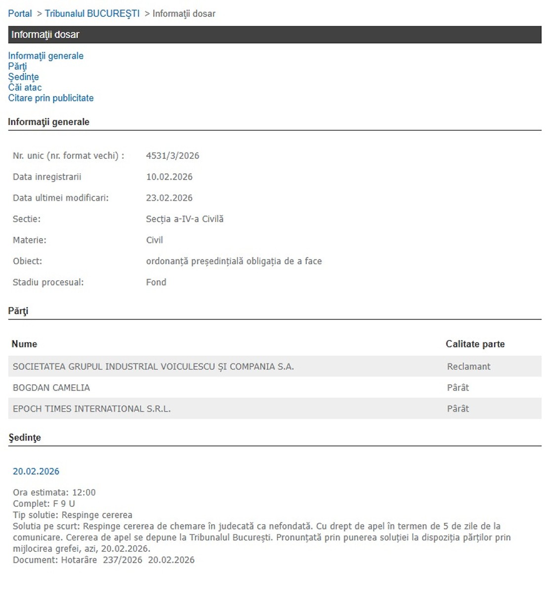 Înalta Curte de Casaţie şi Justiţie (ÎCCJ) a admis cererea de strămutare în dosarul GRIVCO nr. 30172/3/2024, prin dosarul nr. 48/1/2026, stabilind ca instanţă competentă Curtea de Apel Constanţa. Dosarul a primit deja termen la data de 4 mai 2026, la Secţia Civilă I, completul format din judecătoarele Felicia Ivan şi Diana Faur. Judecătoarea a cerut strămutarea pentru a asigura un proces echitabil, ea invocând condiţiile unui climat de ostilitate instituţională la Curtea de Apel Bucureşti.