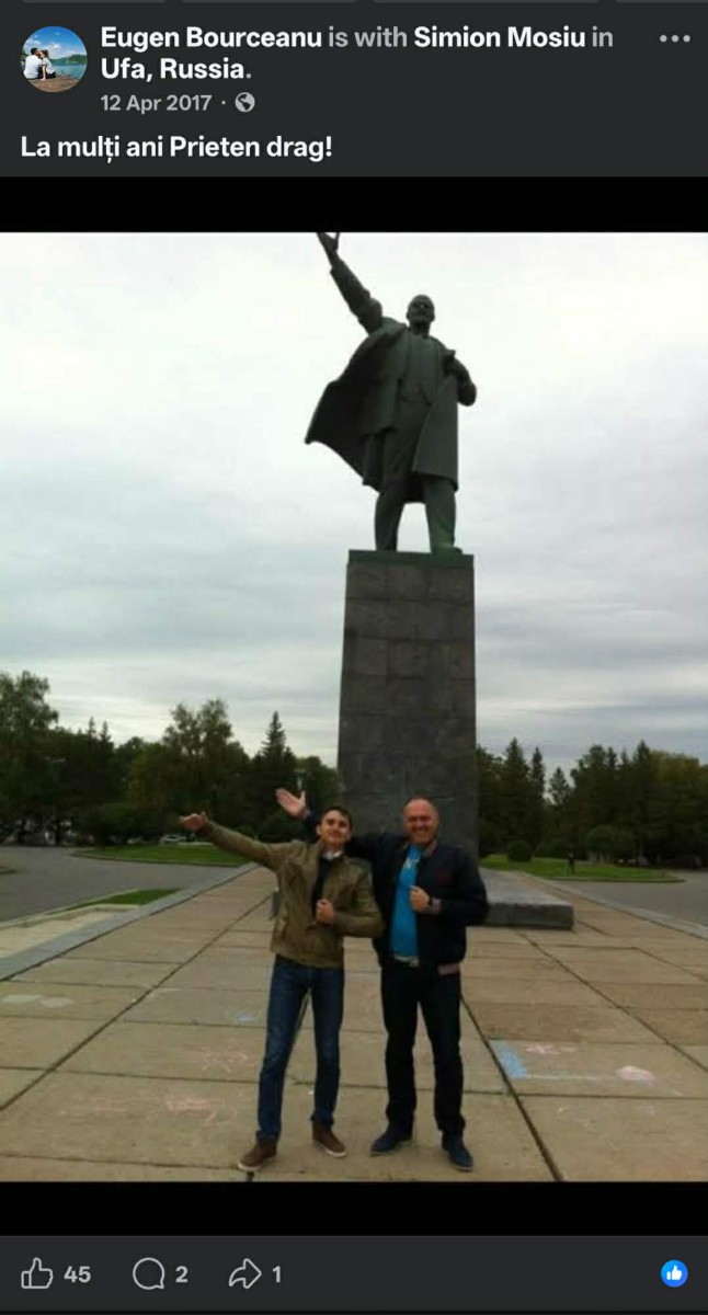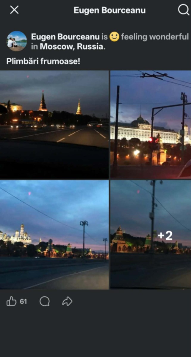 Tot potrivit contului său de Facebook, în aprilie și în iunie 2017, Bourceanu a avut drumuri în așa-zisa Bașchiria (Rusia), unde s-a fotografiat cu o statuie a lui Lenin, dar și la Moscova, unde a fotografiat cu mândrie împrejurimile Kremlinului (foto jos). Nu uitați că în 2014 începuse invazia rusească în Ucraina prin anexarea Crimeii.
