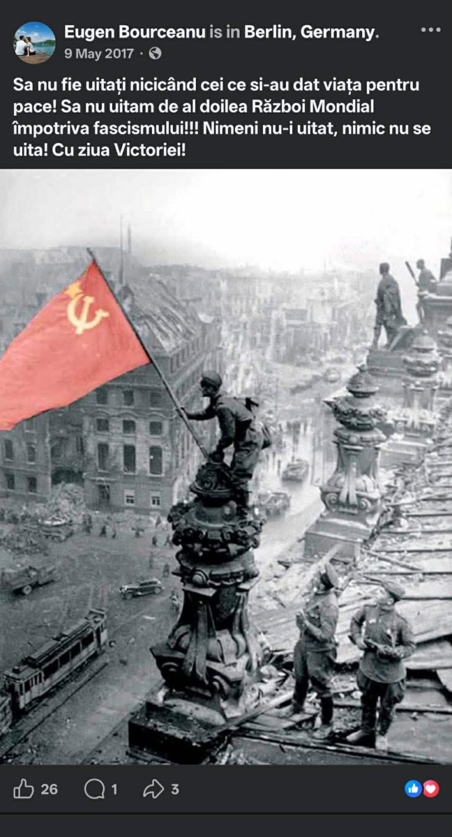Revenind la Eugen Bourceanu, remarcăm că e un iubitor asumat de trupe rusești de ocupație și de russkiy mir. Altminteri, de ce ar fi postat pe contul său de Facebook o așa enormitate sinistră și exaltată la 9 mai 2017 (foto jos), cu prilejul așa-zisei zile a ”victoriei”? E oare normal ca un potențial secretar de stat al DRRM să aibă convingerea, în plin război informational rusesc, că Armata Roșie ne-ar fi ”eliberat” de ”fascism”, așa cum minte propaganda oficială a Kremlinului, pe toate gurile posibile?