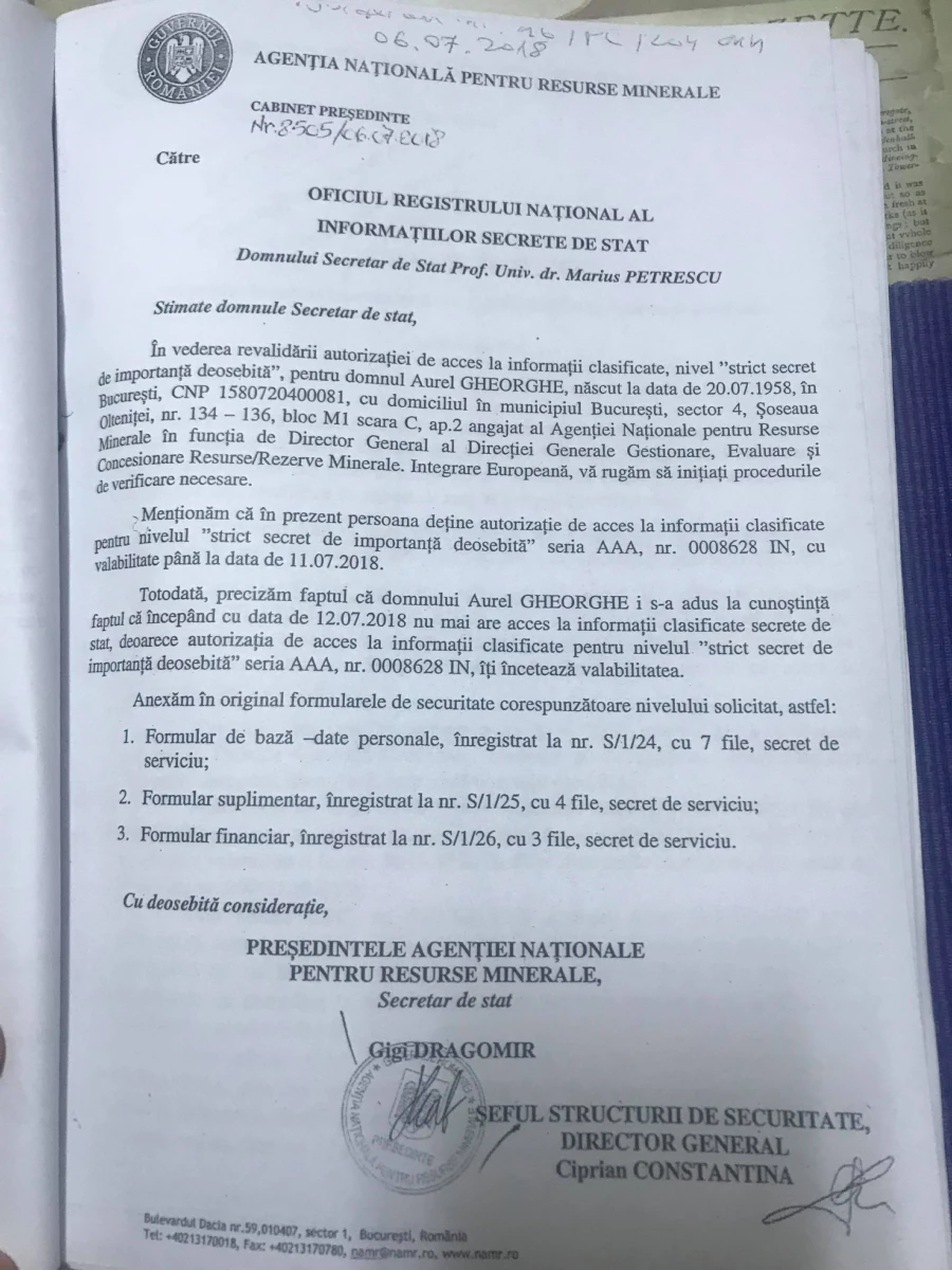 · La data de 11.02.2019, ORNIS răspunde că Gheorghe a fost în procedura de verificare, dar că ulterior ANRM a solicitat în mod expres sistarea procedurilor de verificare în vederea accesului subsemnatului la documente clasificate (cu menţiunea că aceasta a avut loc ulterior ordinului de eliberare din funcţie), iar ORNISS a trimis această solicitare la Autoritate Desemnată pentru Securitate (ADS), respectiv SRI.
