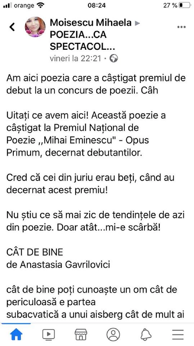Interesantă este și introducerea pe care o face Lorena Lupu respectivului interviu (care poate fi citit integral AICI), surprinzând întocmai ipocrizia și demența din mediul virtual: „Judecând după ce scandaluri furibunde şi veninoase are lumea literară în România, ai jura că e ditamai industria de milioane de euro şi miliarde de fani. Când colo, poetul pe care îl citează majoritatea românilor a scris acum 150 de ani, majoritatea românilor nu citesc nici măcar o carte şi nu-şi cunosc autorii contemporani, editurile trăiesc din traducerile operelor de succes ale autorilor străini şi puţinii autori români care ajung la o formă oarecare de recunoaştere se lovesc instant de ura şi invidia confraţilor de vârste mai înaintate.