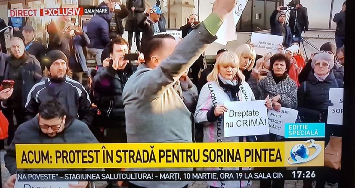 Câteva zeci de persoane s-au adunat joi în fața Palatului de Justiție din Baia Mare pentru a-și manifesta solidaritatea cu șpăgăreasa Sorina Pintea, semn că spălarea pe creier derulată agresiv de Antena 3 produce efecte. (sursa foto: Mălin Bot)