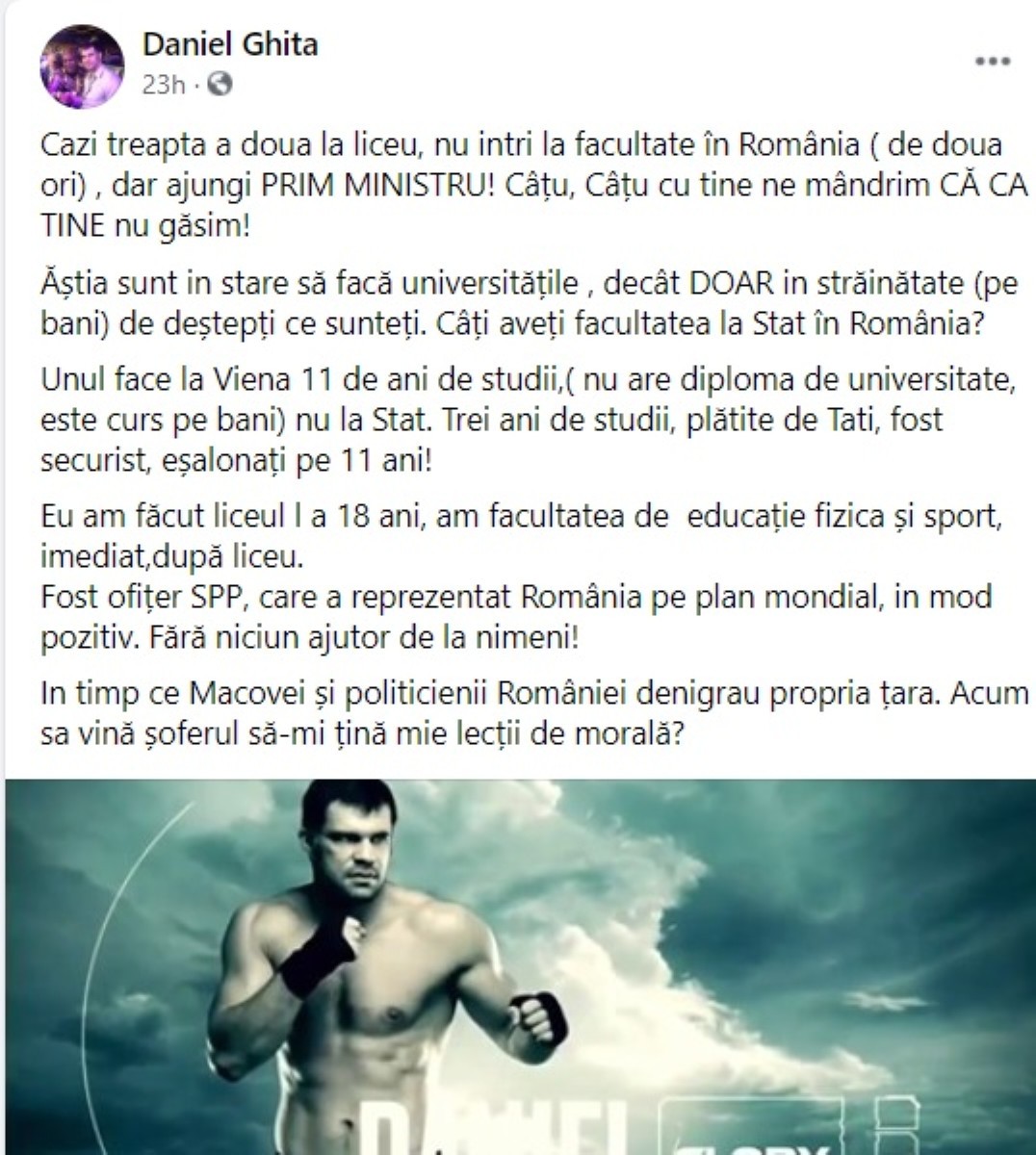 Deputatul PSD de Ilfov abordează pe pagina sa de Facebook subiecte mult mai diverse, nu doar bugetul pe care îl consideră o bătaie de joc la adresa tuturor românilor. Invocă batjocoritor până și studiile premierului Cîțu și ale ministrului Sănătății, Vlad Voiculescu, lăudându-se cu ale sale într-o postare plină de greșeli gramaticale.