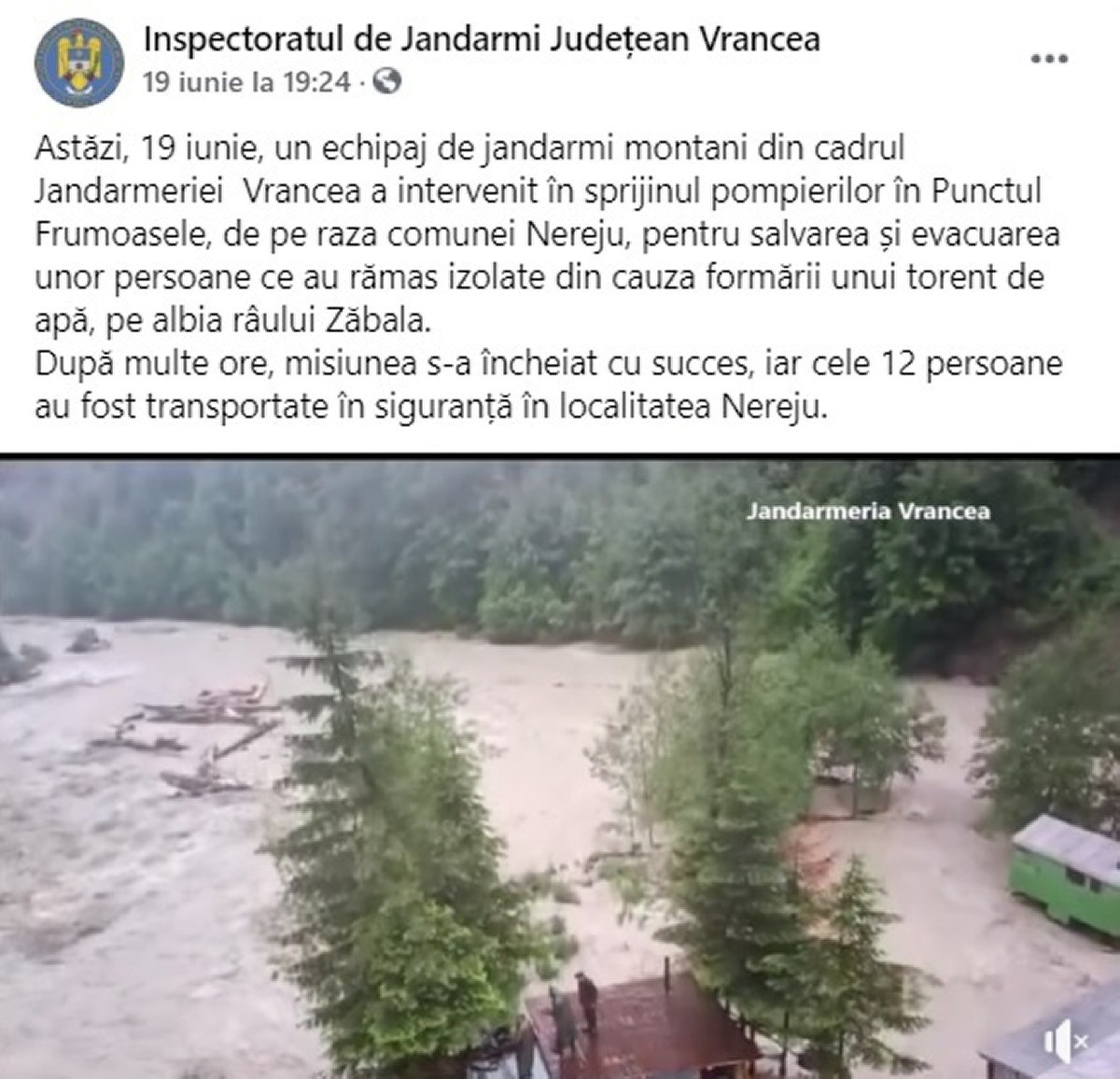 Inspectoratul de Jandarmi Județean (IJJ) Vrancea: „Astăzi, 19 iunie, un echipaj de jandarmi montani din cadrul Jandarmeriei Vrancea a intervenit în sprijinul pompierilor în Punctul Frumoasele, de pe raza comunei Nereju, pentru salvarea și evacuarea unor persoane ce au rămas izolate din cauza formării unui torent de apă, pe albia râului Zăbala. După multe ore, misiunea s-a încheiat cu succes, iar cele 12 persoane au fost transportate în siguranță în localitatea Nereju”.