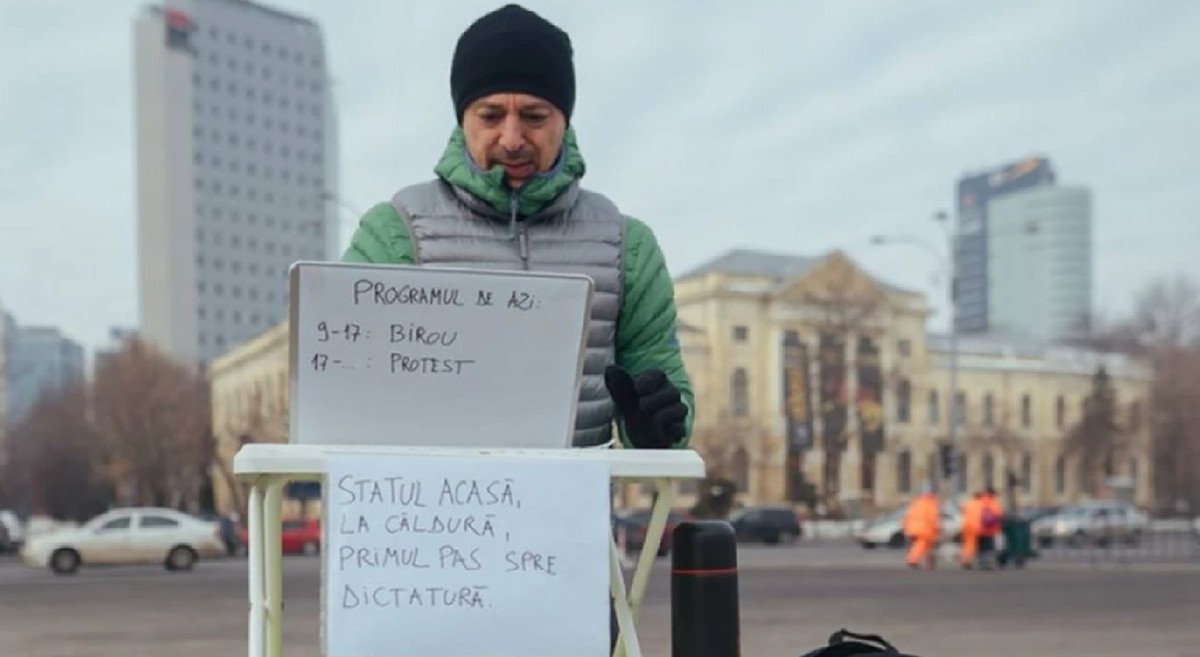 Andrei Roșu a atras atenția la începutul lunii februarie 2017 când și-a adus biroul în Piața Victoriei (foto sus, Adi Bulboacă), având scris pe una din hârtiile de protest un mesaj percutant: „Statul la căldură, primul pas spre dictatură”.