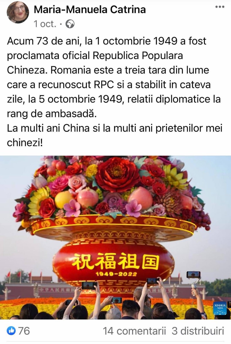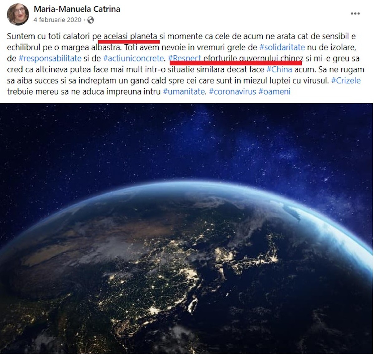O altă postare de la începutul pandemiei de coronavirus (foto jos), din februarie 2020, trădează admirația acesteia pentru China, dar și o cunoaștere precară a limbii române, scriind „aceiași planeta” în loc de „aceeași” (în CV-ul consultat de Podul pe siteul Poștei Române, Catrina afirmă că vorbește cel puțin patru limbi străine, engleza și germana EXCELENT, iar franceza și spaniola BINE. (DETALII AICI)