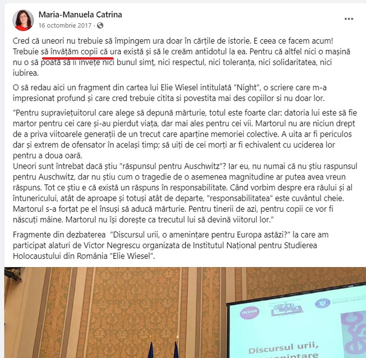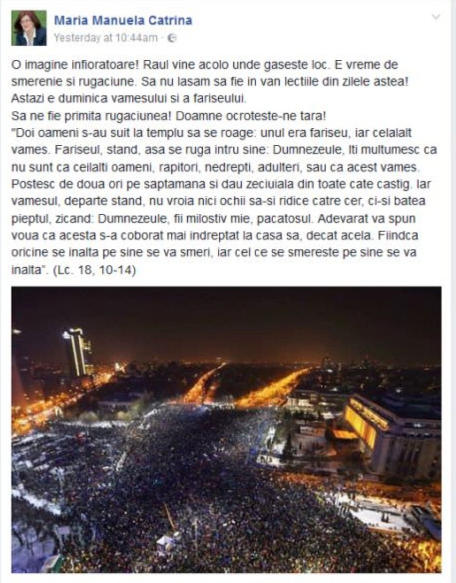 „O imagine înfiorătoare! Răul vine acolo unde găseşte loc. E vreme de smerenie şi rugăciune. Să nu lasăm să fie în van lecţiile din zilele astea! Astăzi e Duminica vameşului şi a fariseului. Să ne fie primită rugăciunea! Doamne ocroteşte-ne ţara!”, a scris pe Facebook Maria-Manuela Catrina, alături de un citat din Biblie şi o imagine de la protestele din Piaţa Victoriei, lăsând să se înţeleagă că vede coarnele diavolului în fotografia făcută mulţimii de protestatari.