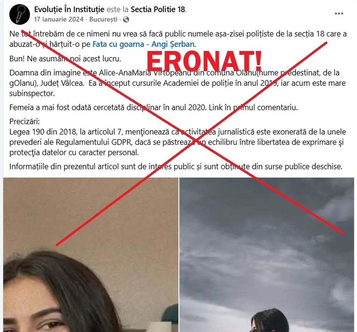 RECTIFICARE/ERATĂ! Polițista Alice Vîrtopeanu de la Secția 18 - cu rol cheie în abuzul suferit de activista Angi Șerban în ianuarie 2024, când a fost săltată de poliție de la o altă adresă decât cea de domiciliu, după o postare pe pagina sa de Facebook în contextul protestelor fermierilor de la acel moment - nu este aceeași polițistă care o sfătuise anterior incidentului cu Angi Șerban pe victima unui caz de hărțuire stradală să nu depună plângere împotriva agresorului, covingând-o că ar trebui să se simtă măgulită de felul în care a fost „complimentată”.