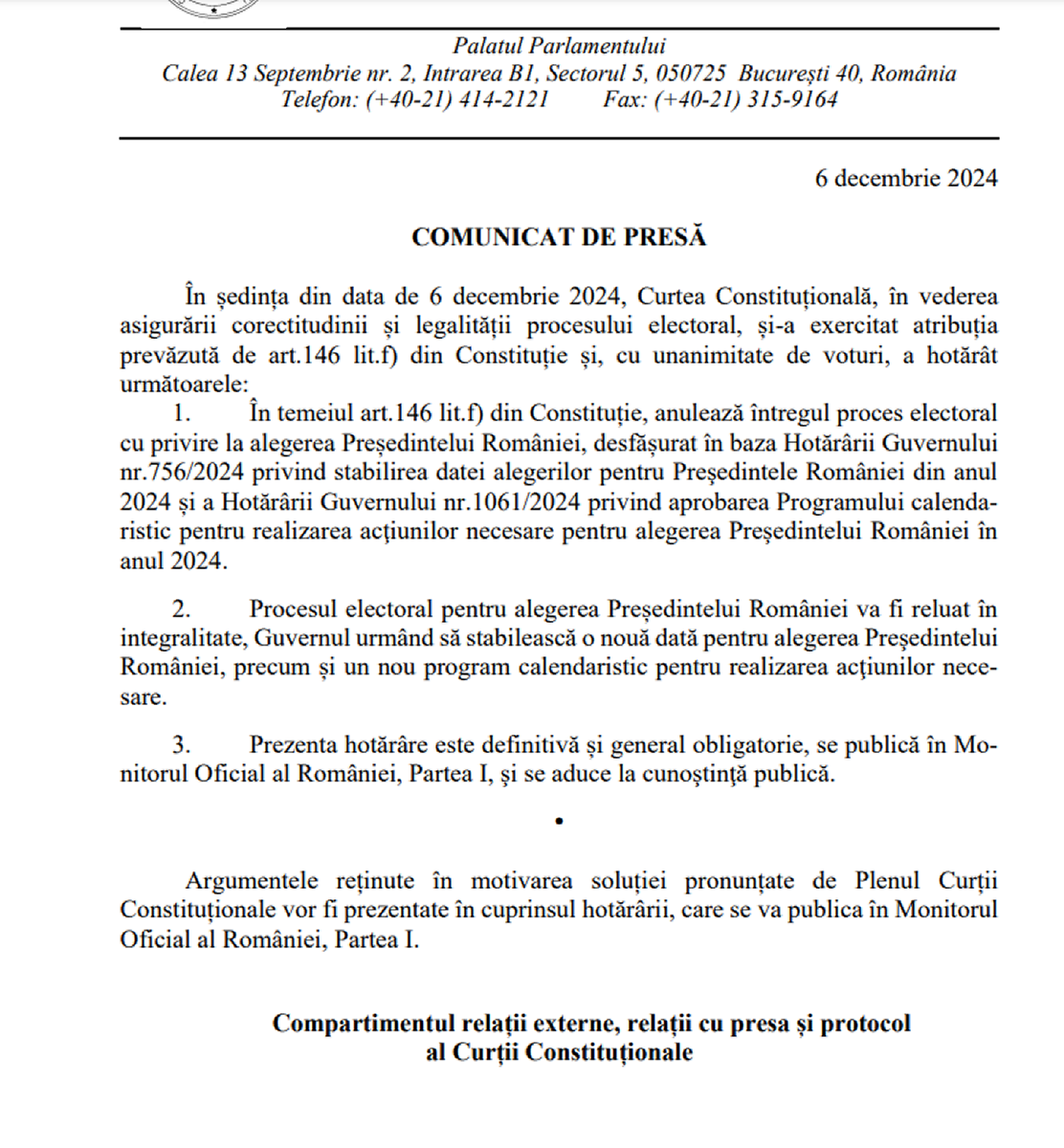 CCR anunţă că în şedinţa din data de 6 decembrie 2024, a hotărât că în temeiul art.146 lit.f) din Constituţie, anulează întregul proces electoral cu privire la alegerea Preşedintelui României, desfăşurat în baza Hotărârii Guvernului nr.756/2024 privind stabilirea datei alegerilor pentru Preşedintele României din anul 2024 şi a Hotărârii Guvernului nr.1061/2024 privind aprobarea Programului calendaristic pentru realizarea acţiunilor necesare pentru alegerea Preşedintelui României în anul 2024.