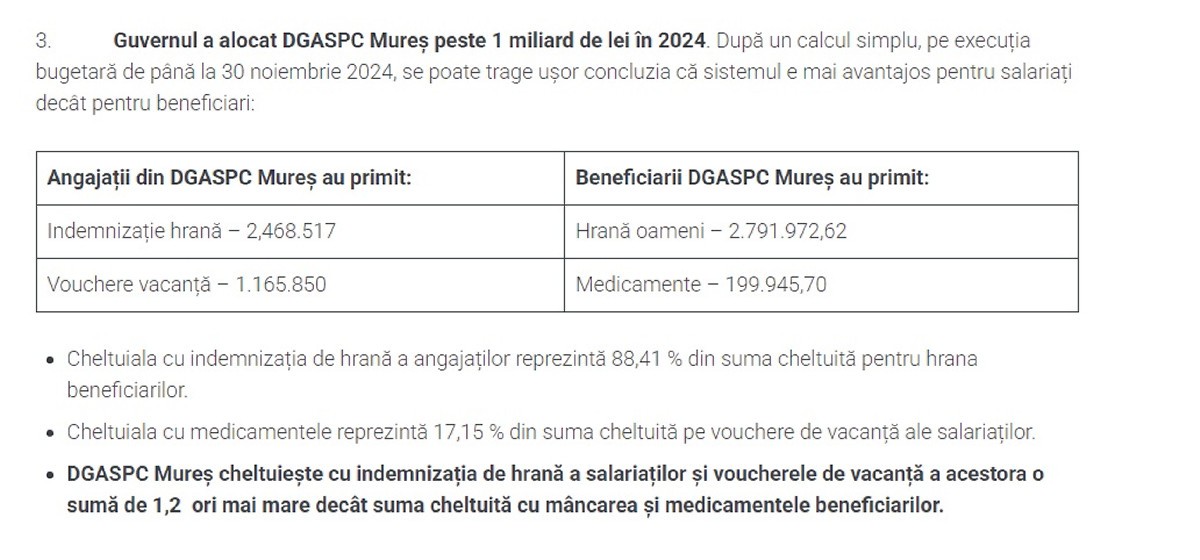 3. Guvernul a alocat DGASPC Mureș peste 1 miliard de lei în 2024. După un calcul simplu, pe execuția bugetară de până la 30 noiembrie 2024, se poate trage ușor concluzia că sistemul e mai avantajos pentru salariați decât pentru beneficiari:
