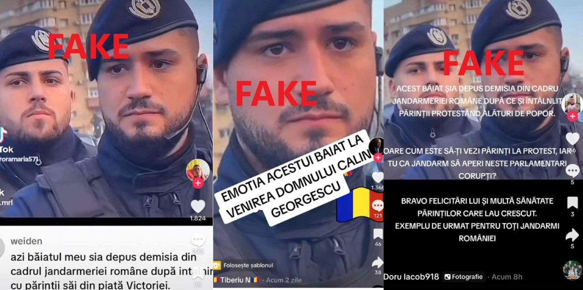 Mic context. Imaginea unui jandarm surprins în timp ce se afla în dispozitiv, în Piața Victoriei, la unul din mitingurile recente pro-Călin Georgescu, este vehiculată de susținătorii pro-rusului pentru a arăta, chipurile, că și organele statului ar susține opțiunea lor. Manipularea este în ton cu cele afirmate de Georgescu în ultimele zile cu privire la angajații din structurile de forță ale statului care s-ar fi săturat de actuala conducere și l-ar susține pe el pentru funcția supremă în stat, considerându-l „președintele” deja „ales” (deși turul doi al prezidențialelor nu a mai avut loc).