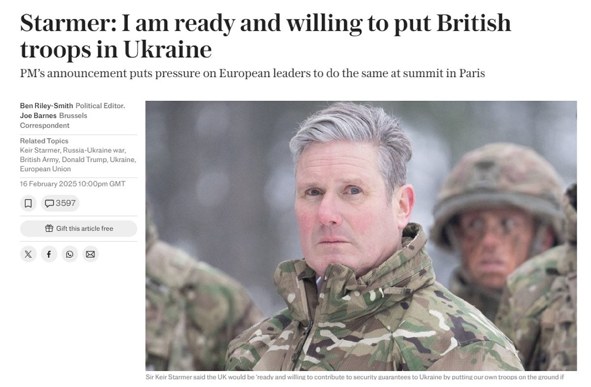 Premierul Marii Britanii, Keir Starmer, a declarat pentru The Telegraph că este „gata” să trimită trupe britanice terestre în Ucraina pentru a contribui la garantarea securității acesteia, ca parte a unui acord de pace.