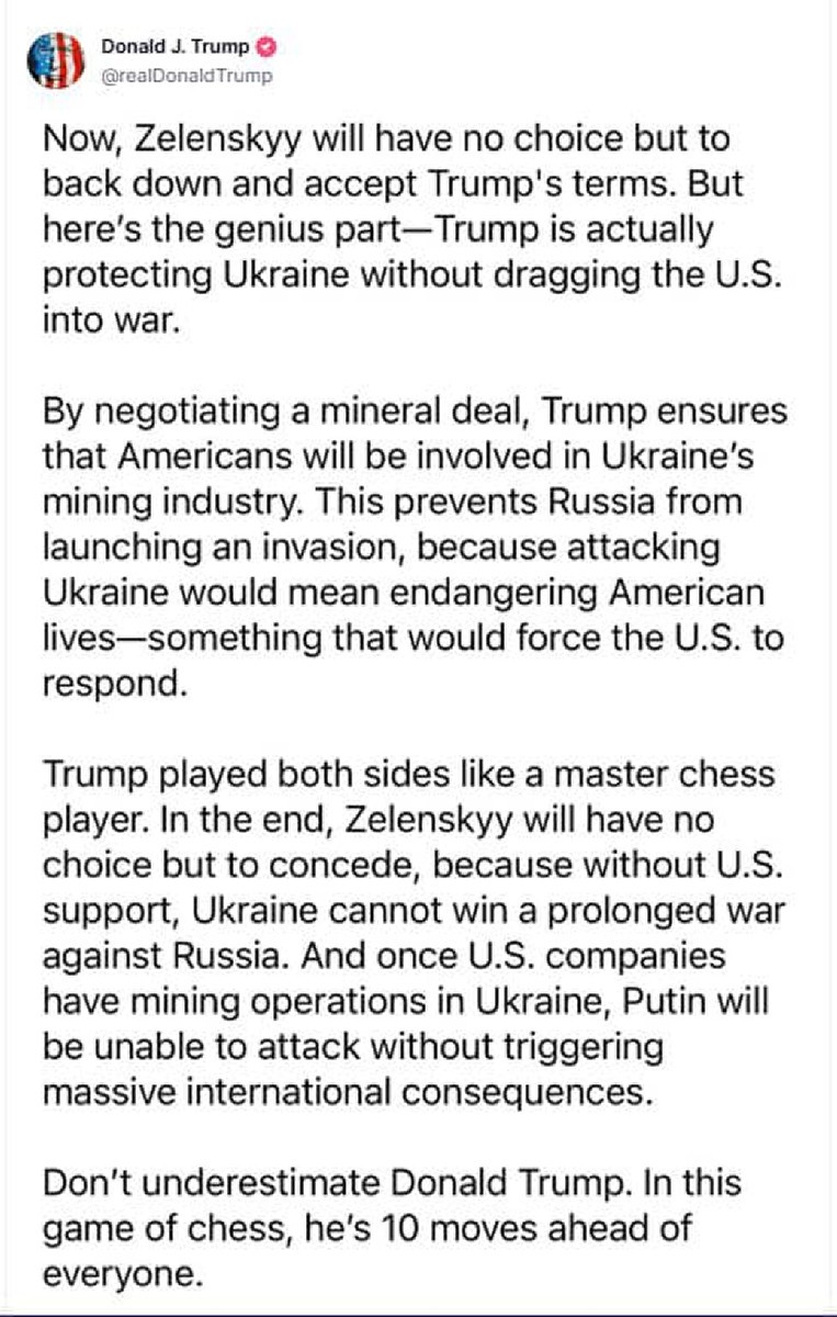 Și Donald Trump a scrie pe platforma sa Truth Social că Volodimir Zelenski nu va avea de ales şi va accepta termenii lui “geniali” în ce priveşte acordul privind exploatarea mineralelor.