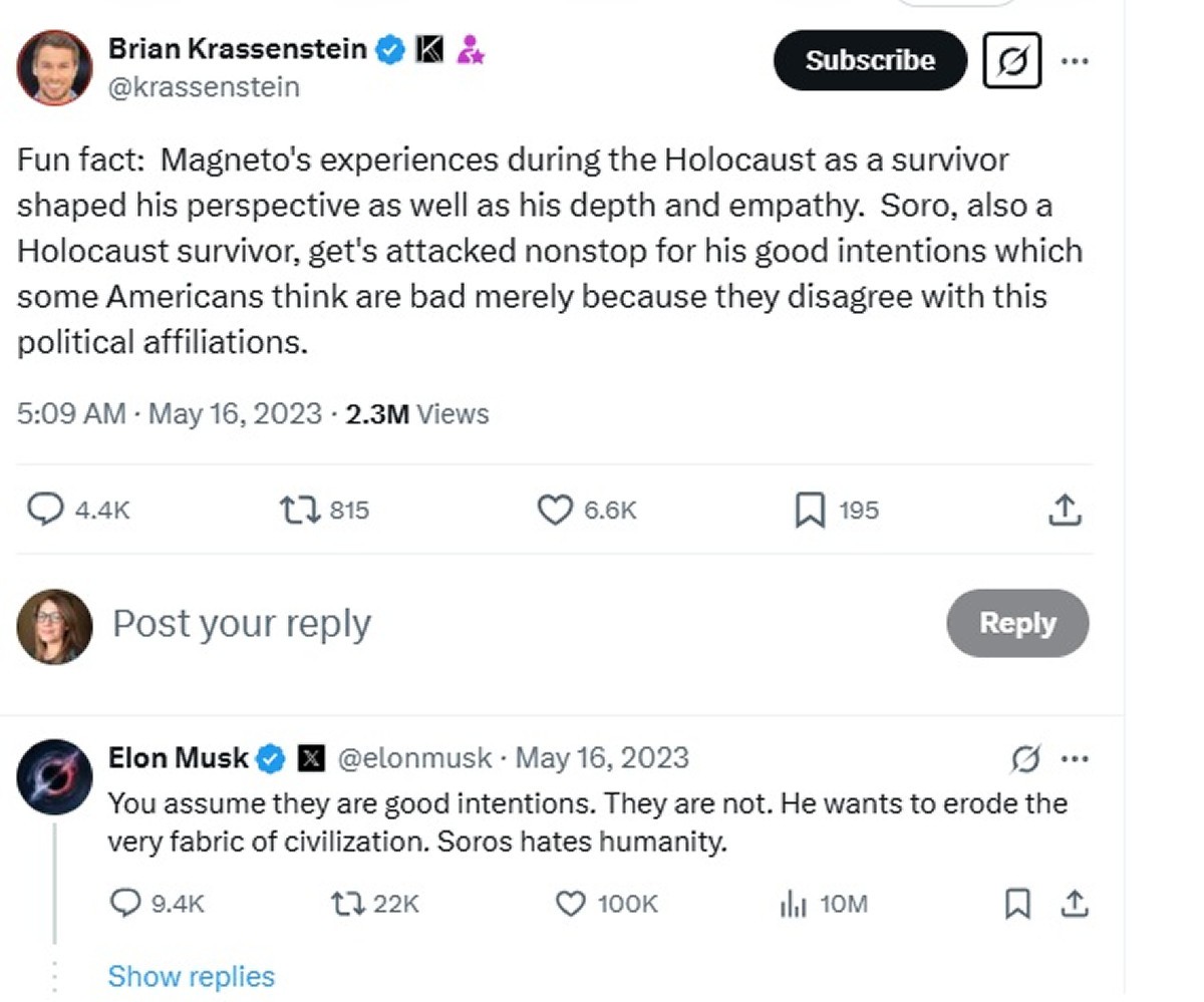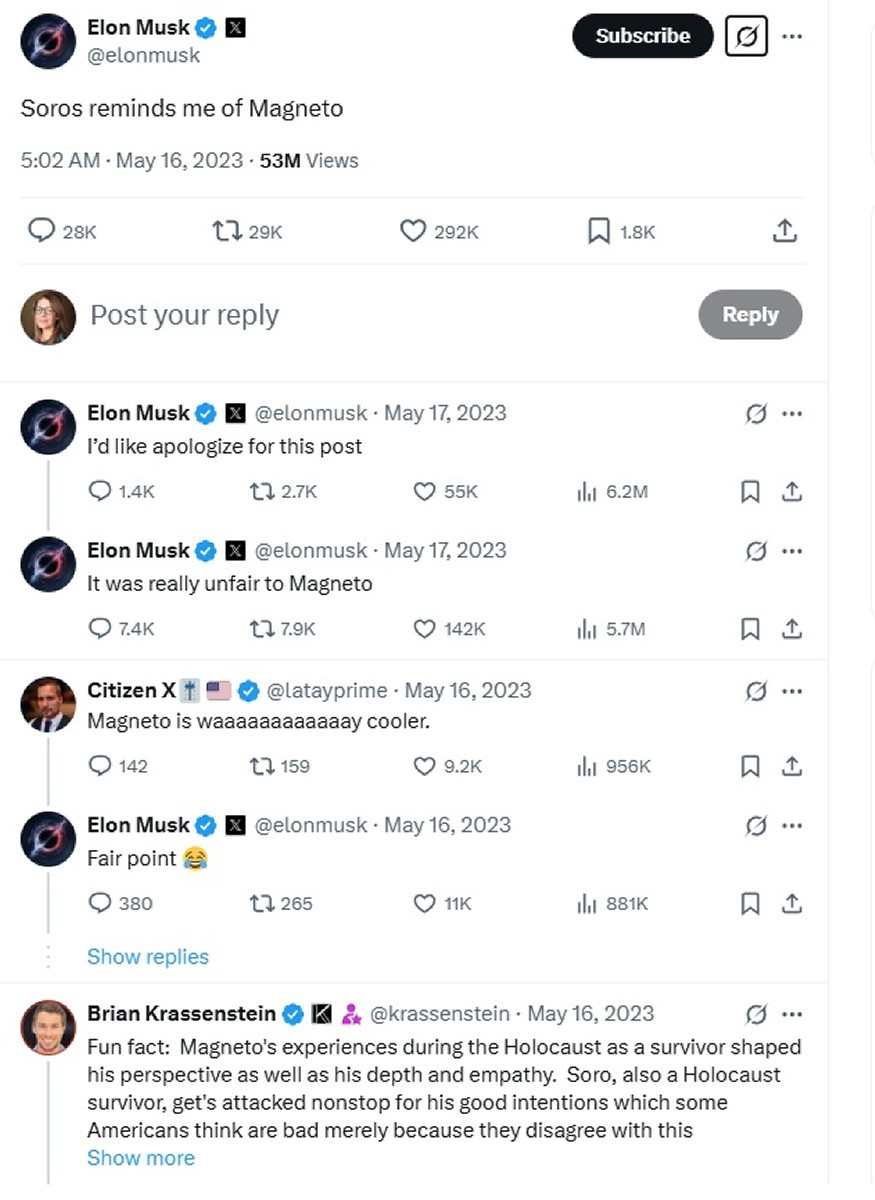 În mai 2023, într-o postare pe X, Musk îl compara pe Soros cu „Magneto”, personaj negativ din seria de benzi desenate X-Men, adăugând că fostul său partener de afaceri ar „vrea să destrame esența civilizației" și că "urăște omenirea", afirmații amendate apoi de mai multe organizații drept „antisemite”.