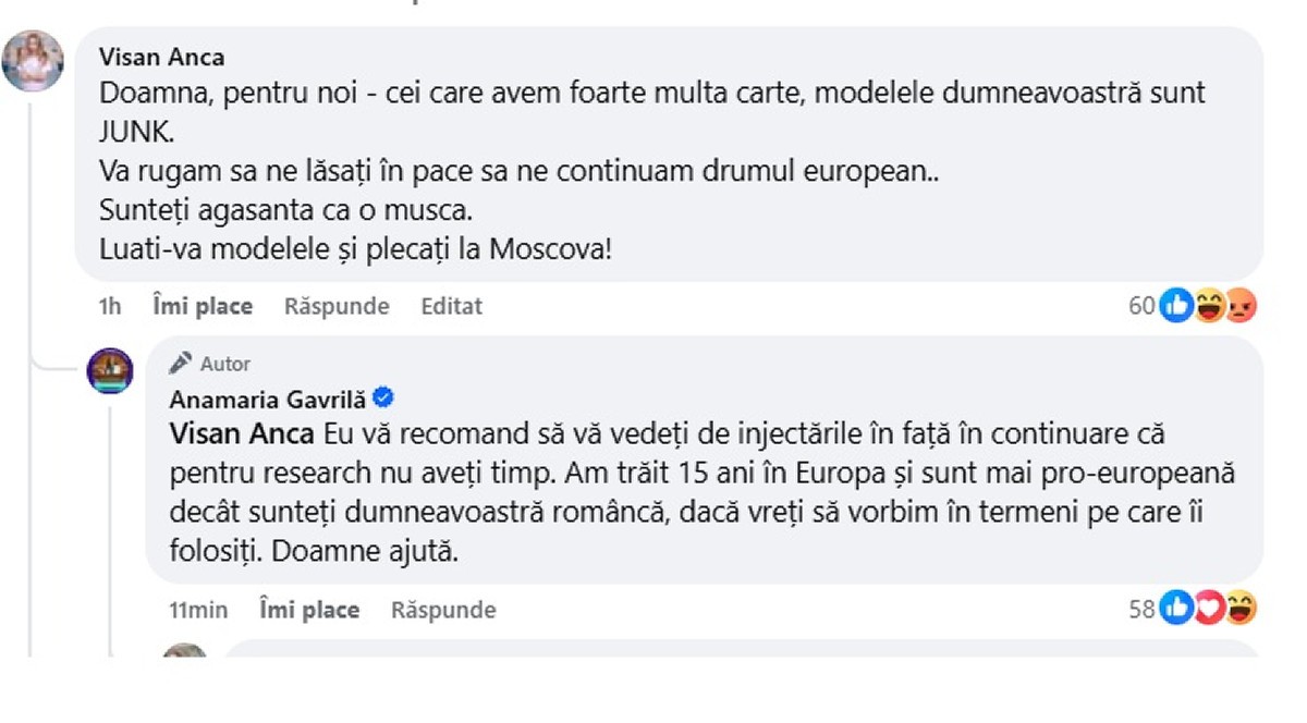 „Doamnă, pentru noi - cei care avem foarte multă carte, modelele dumneavoastră sunt JUNK. Vă rugăm să ne lăsați în pace să ne continuăm drumul european. Sunteți agasantă ca o muscă. Luați-vă modelele și plecați la Moscova!”, i-a scris doctorița într-un comentariu.