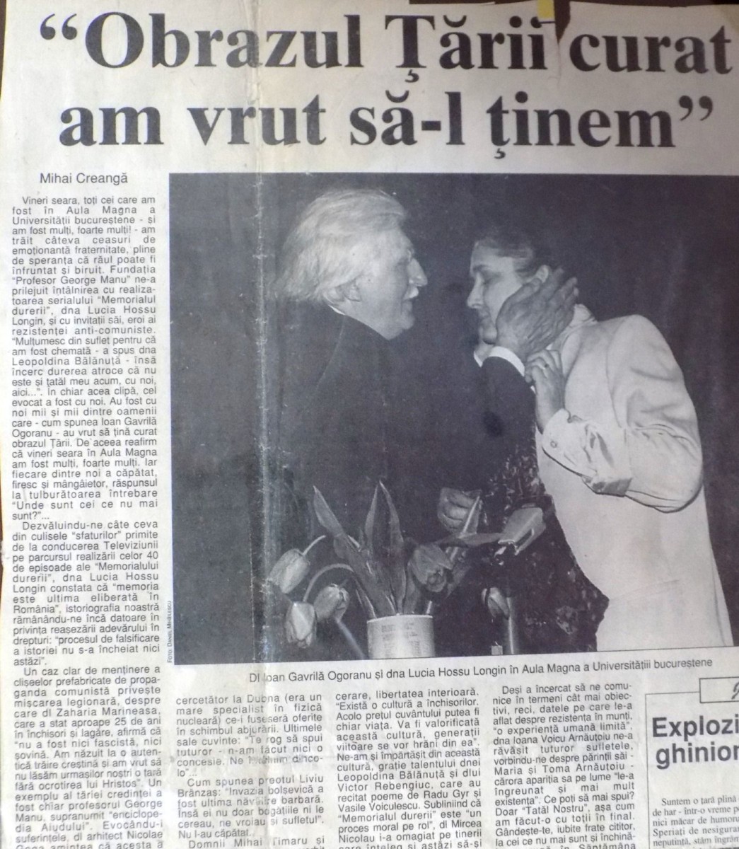 Cuvintele sunt neputincioase în fața abominației verbale dezlănțuite asupra frunții unui om ce merită laurii recunoștinței noastre. Așa că tot ce pot să fac este să las aici această imagine (foto jos) rămasă ca o efigie a ceea ce ne leagă de Lucia Hossu Longin: momentul în care Ion Gavrilă Ogoranu, cel care o iubea și o prețuia cu nesfârșită recunoștință, o sărută pe frunte, în Aula Universității din București, surprins în ziarul România Liberă, în dreptul unui articol al regretatului Mihai Creangă despre una din conferințele dedicate memoriei Rezistenței, în 1995. Și îmi imaginez cum i-ar fi privit atât de curatul și integrul Gavrilă pe cei ce astăzi umplu internetul cu lături. O tempora!...