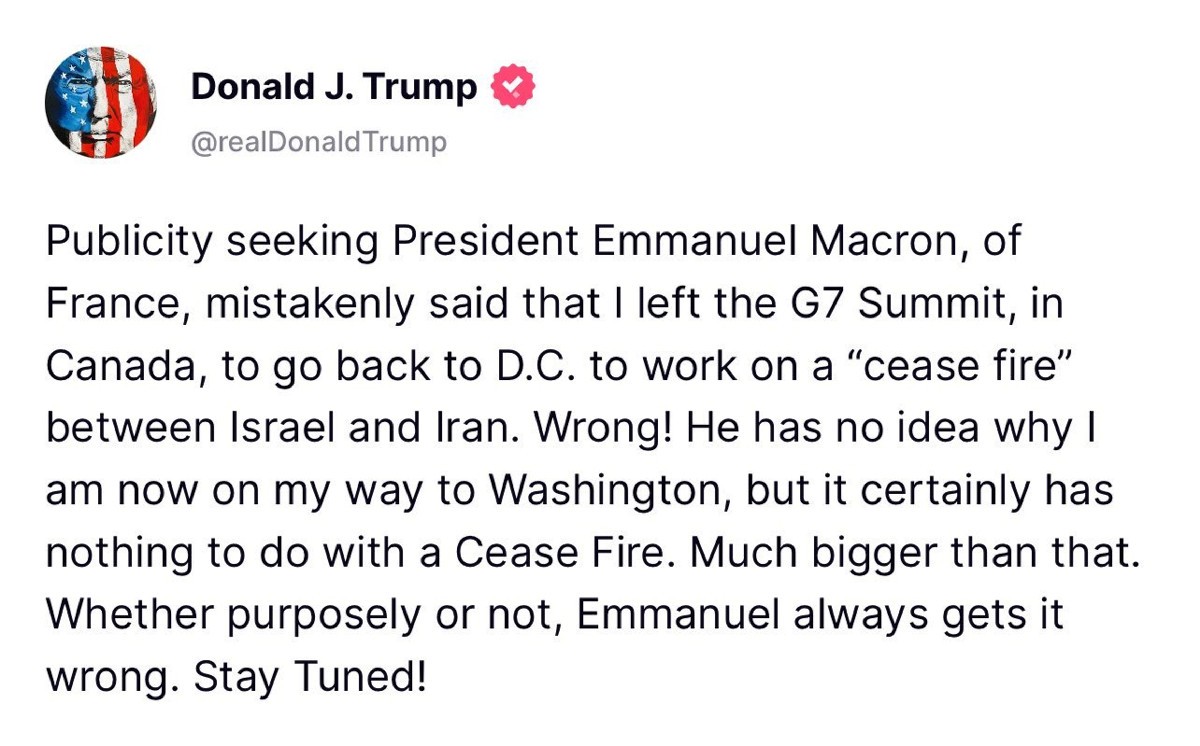 „Aflat în cautare de publicitate, președintele Franței, Emmanuel Macron, a afirmat în mod eronat că am părăsit summitul G7 din Canada revenind la Washington pentru a lucra la o „încetare a focului” între Israel și Iran. Greșit! Habar nu are de ce mă aflu acum în drum spre Washington, dar cu siguranță plecarea mea nu are nimic de-a face cu o încetare a focului. Este vorba de ceva mult mai important. Intenționat sau nu, Emmanuel se înșeală întotdeauna. Rămâneți pe recepție!”, a transmis Donald Trump.
