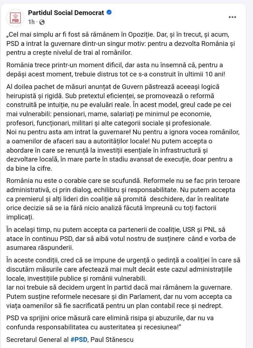Luni, baronul PSD s-a declarat public indignat, acuzând că cel de-al doilea pachet de măsuri propus de șeful guvernului, Ilie Bolojan, „păstrează aceeași logică heirupistă și rigidă” și amenințând, voalat, cu ieșirea de la guvernare.