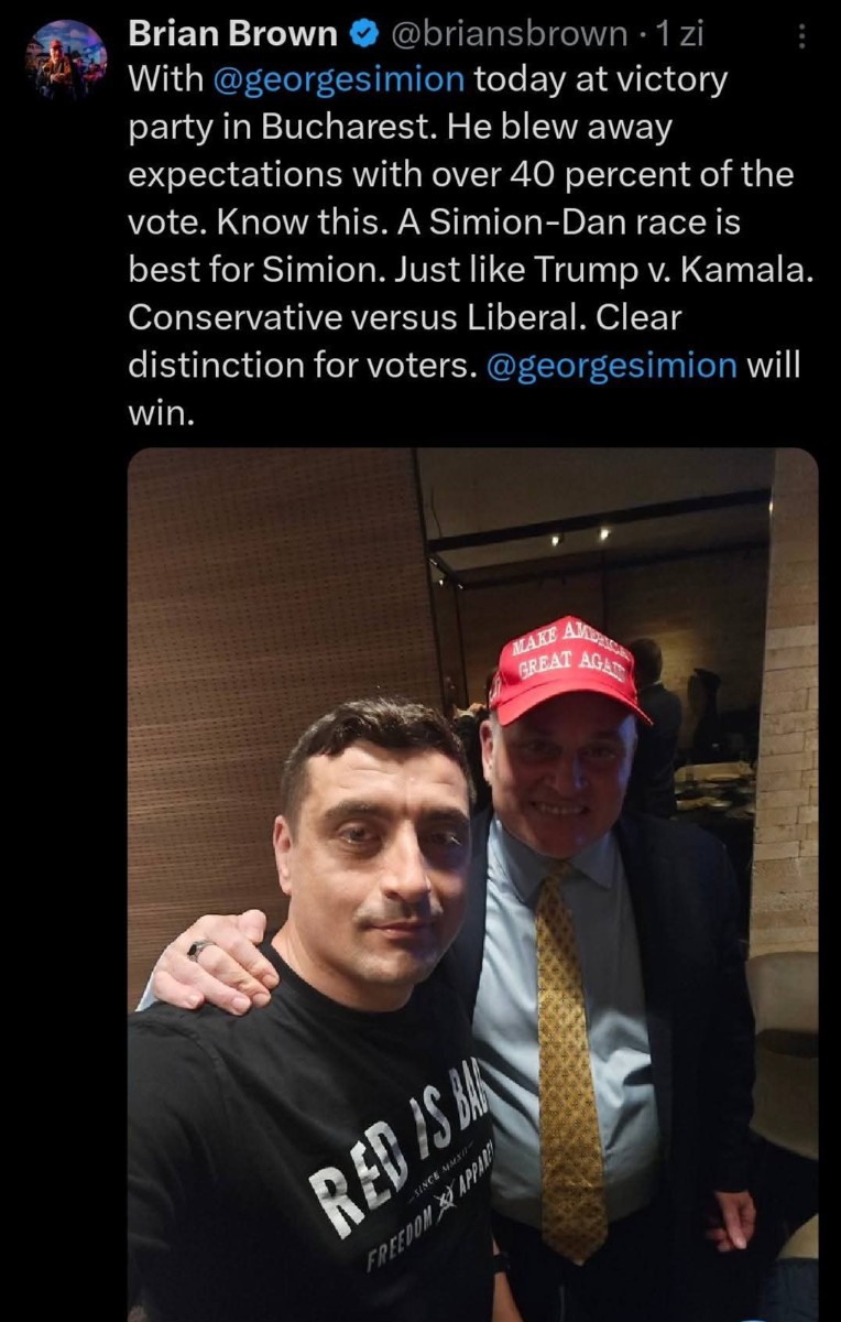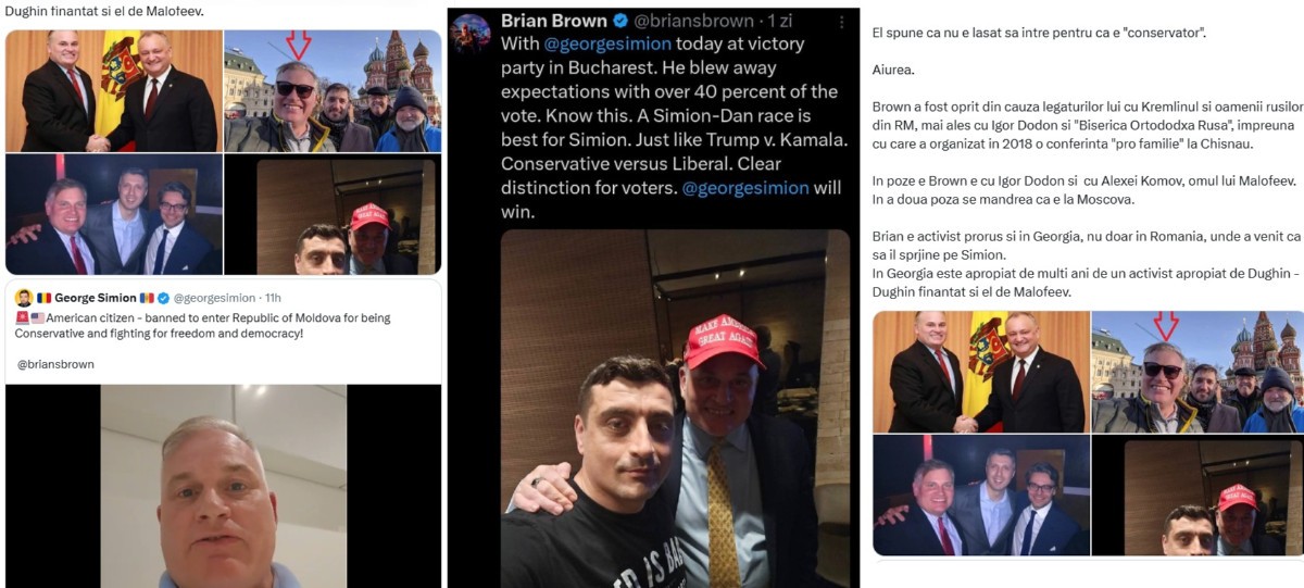 „Activistul american prorus Brian Brown, colaborator al oligarhului rus Konstantin Malofeev (unul dintre printre primii ruși cu interdicție de intrare în Europa și SUA din 2014 pentru finanțarea crimelor rusești din Ucraina), se plange într-un clip (re)postat de George Simion ca nu este lasat să intre în R.Moldova, ca sa participe la conferința lui George Simion, "Make Europe Great Again".