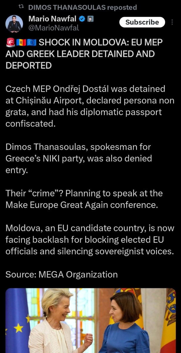 Potrivit unui comunicat transmis de siteul oficial al evenimentului mega2025.eu, și lui Dimos Thanasoulas, purtător de cuvânt al partidului suveranist grec NIKI, i-a fost refuzat accesul în Republica Moldova.