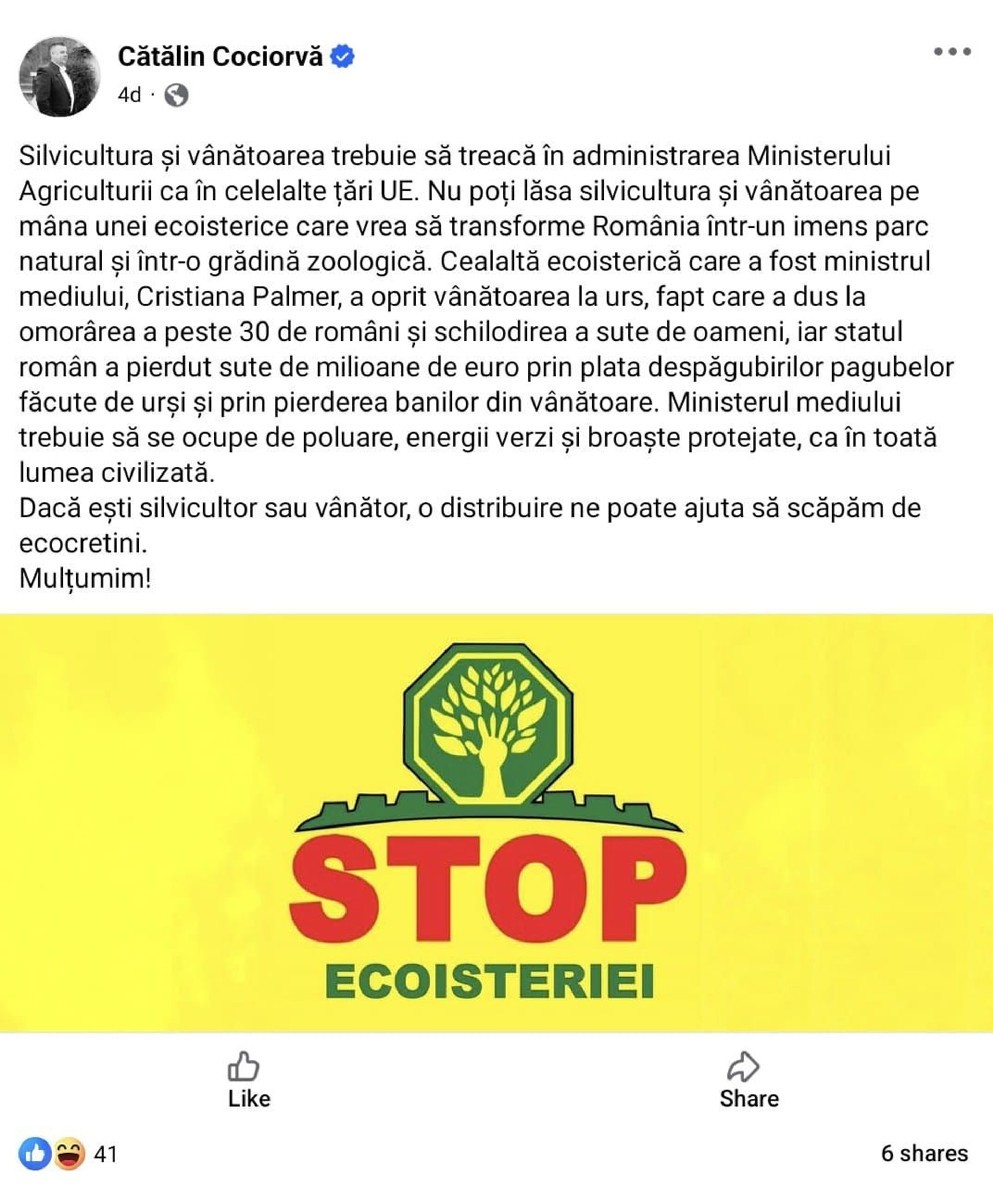 De altfel, și o serie de angajați Romsilva au reacționat foarte dur, uneori chiar jignitor, la inițiativele de reformă și transparență propuse de noul ministru al Mediului. În rețele circula deja o postare care îi aparține lui Cătălin Cociorvă, angajat la Ocolul Silvic Roznov (Neamț) care spune despre Buzoianu că ar fi „o ecoisterică”.