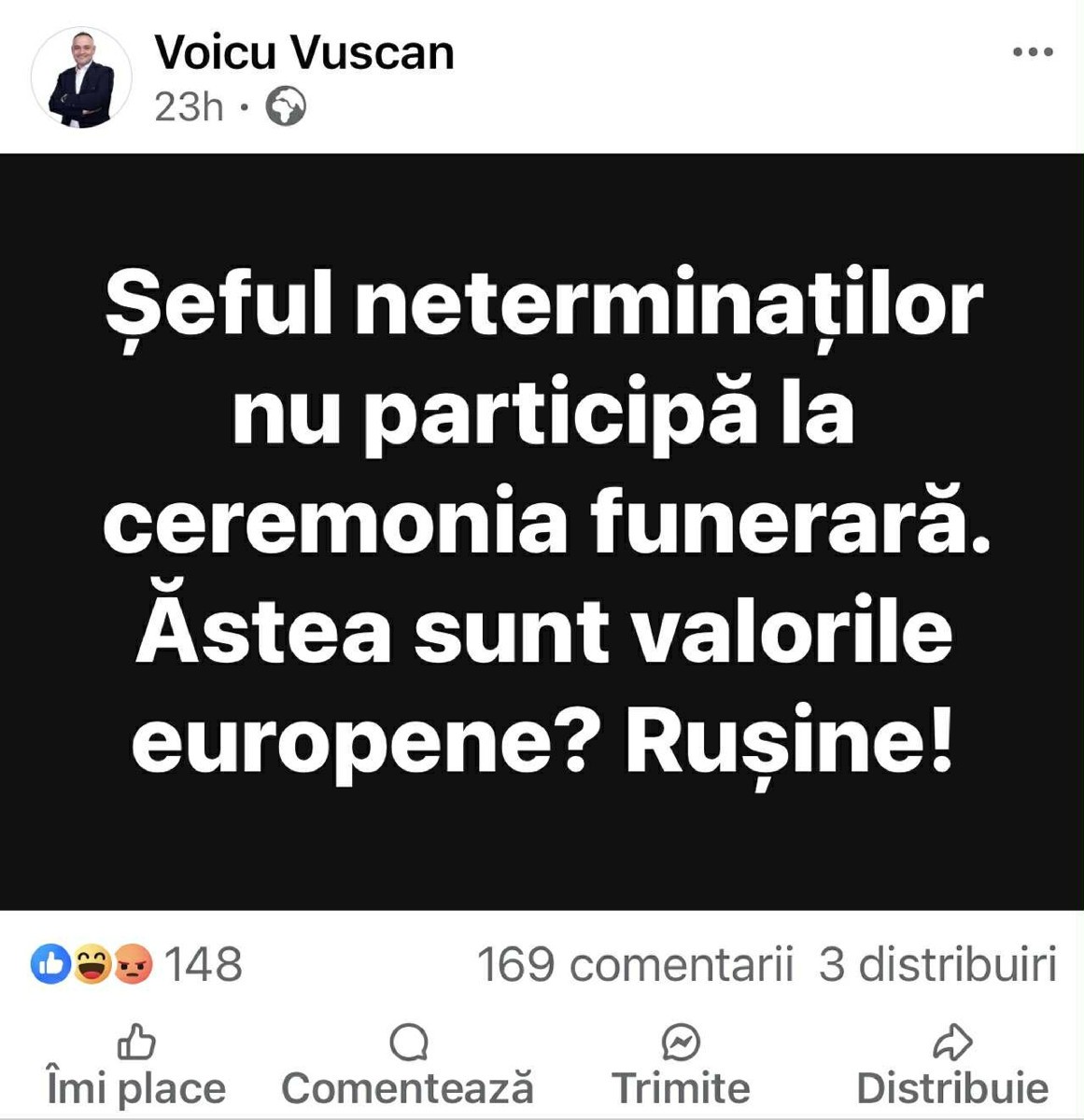 „Pe voi, cele mai mari scursuri ale societății, cancerul societății românești actuale, rușinea rușinilor, care mergeți să reprezentați România în genunchi, pentru că nu aveți nimic românesc în voi, nici măcar copiii voștri nu vă vor regreta, pentru că ei nu vă consideră mama și tata, ci părinte 1 și părinte 2. Ați prostit poporul anul ăsta, dar 2028 e mâine și veți merge unde vă este locul: la groapa de gunoi a istoriei. Marsh!”, a scrie Vuscan într-o postare pe pagina sa oficială de Facebook.