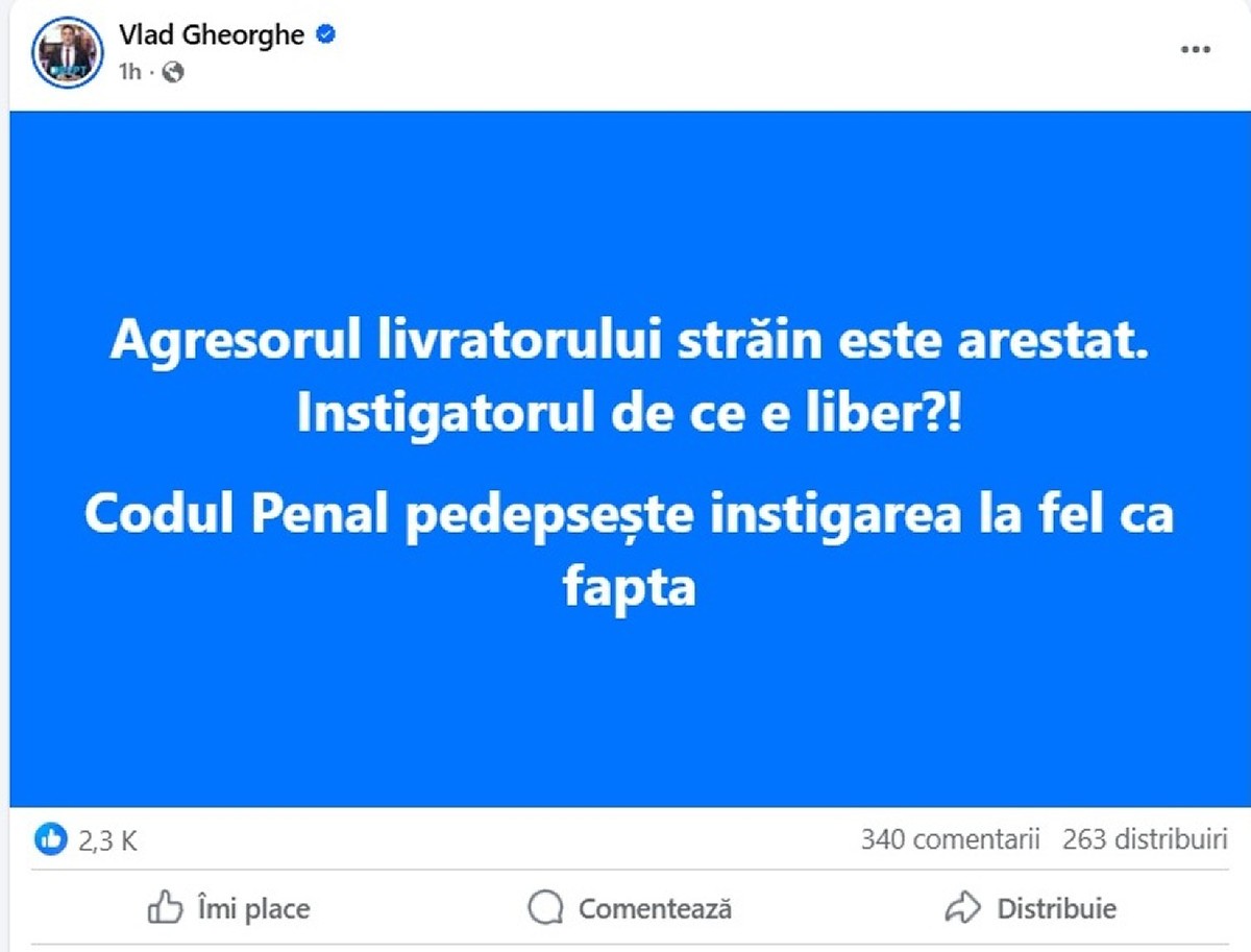 „Agresorul livratorului străin este arestat. Instigatorul de ce e liber?! Codul Penal pedepsește instigarea la fel ca fapta”, scrie Vlad Gheorghe care este de profesie jurist.