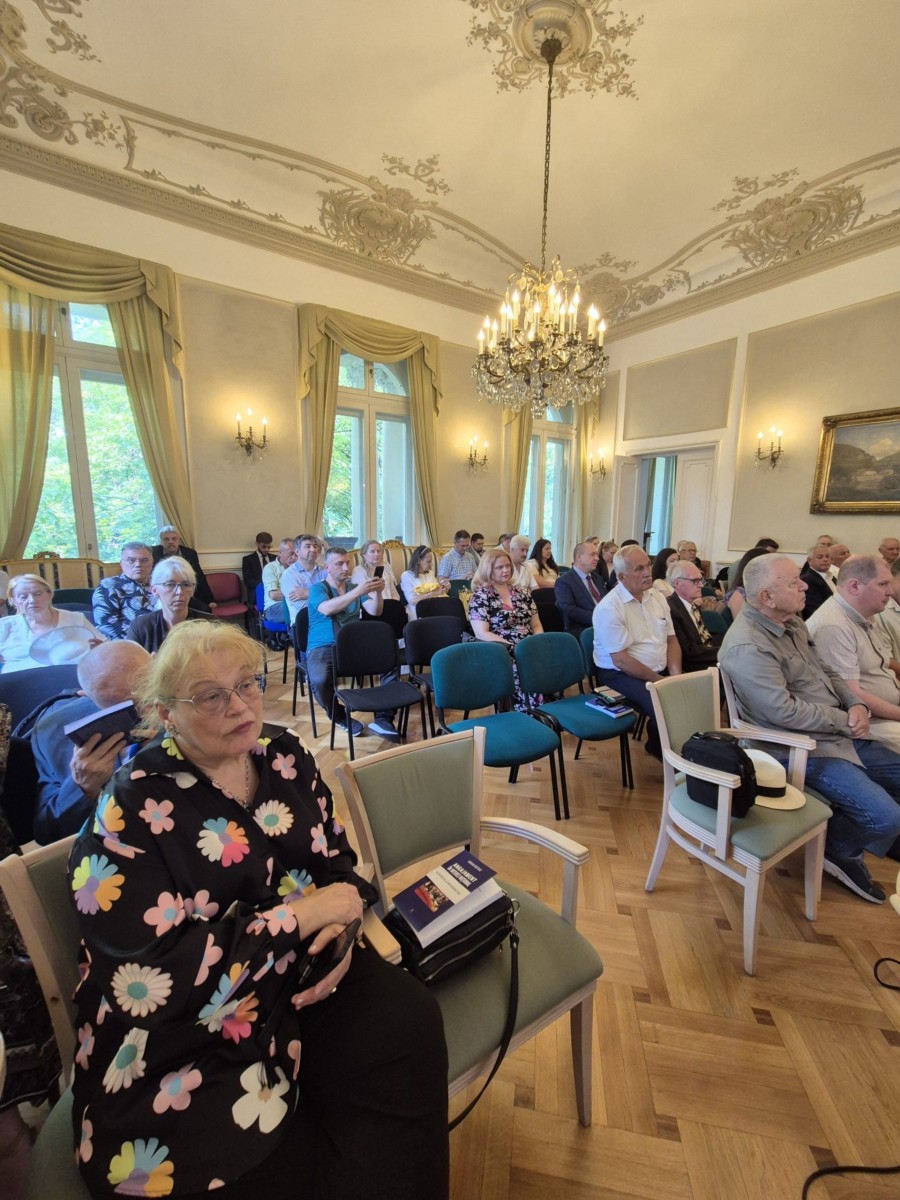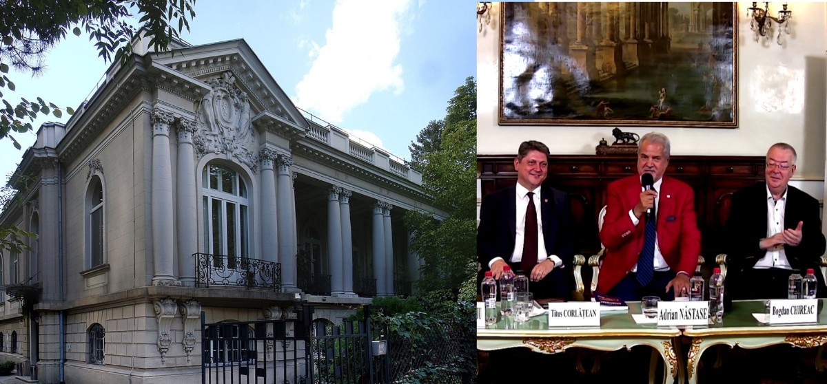 Foto jos: imagine din somptuoasa sală a clădirii istorice din Șos. Kiseleff nr. 47 pe care RAPPS i-a acordat-o lui Năstase pentru 49 de ani în vremea guvernării lui Adrian Năstase (2001)! În prim plan sunt și cele două beizadele ale cuplului Năstase: Andrei (mijloc) și Mihnea (dreapta imaginii), mari amatori de lux. Andrei Năstase este partener de afaceri de milioane de euro cu nașul său de cununie, controversatul Horia Constantinescu, pus de PSD șef peste Protecția Consumatorului, una din instituțiile acuzate că ar fi protejat compania Nordis în timp ce aceasta comitea mega-escrocherii imobiliare. Reamintim și că Mihnea Năstase, fiul cel mic al premierului borfaș, primea și el, în vremea guvernului Dăncilă, un post de consilier