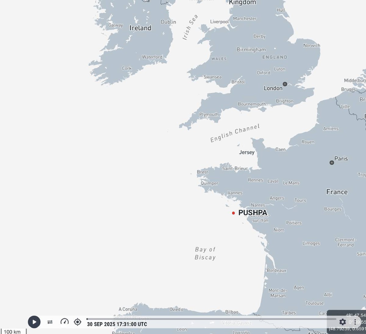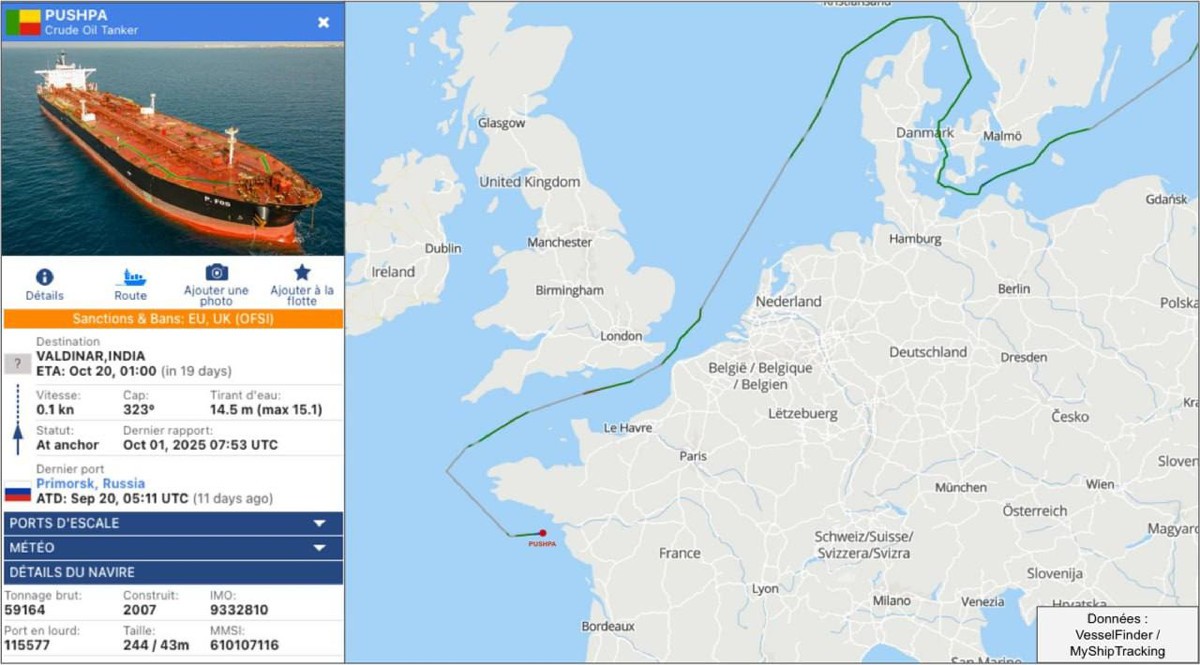 Plecată pe 20 septembrie din portul Primorsk (vestul Rusiei, în Marea Baltică), potrivit datelor site-ului specializat Marine Traffic, „Pushpa” a ajuns în zonă sâmbătă, potrivit ICI Loire Océan. De atunci, ea face manevre foarte limitate, aruncând uneori ancora, înainte de a porni din nou motoarele doar pentru a efectua „cercuri în apă”, a relatat marţi ziarul Presse-Océan. Descrierea a fost confirmată de imagini aeriene difuzate miercuri pe LCI.
