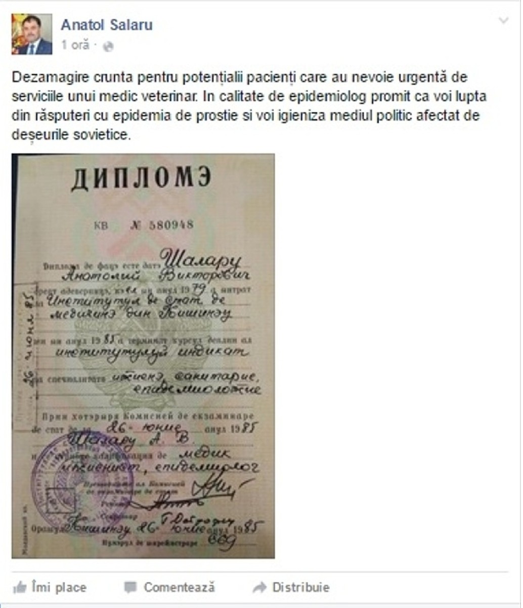 Șalaru și-a postat, în 2016, diploma de absolvire a Facultății de Medicină: