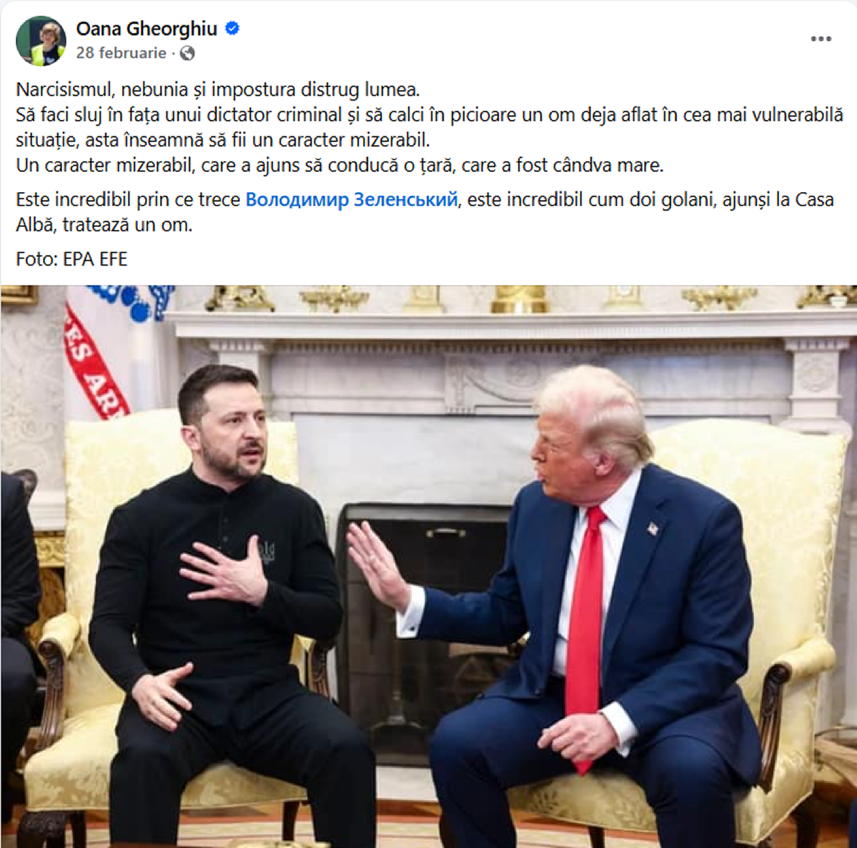 Postarea care a stârnit acum reacții critice a fost făcută într-un context emoțional foarte încărcat, întâlnirea din februarie, din Biroul Oval, cu președintele Zelenski, ceea ce a avut un impact direct asupra modului în care a fost formulată. Nu am fost singura care a fost tulburată de acel eveniment.