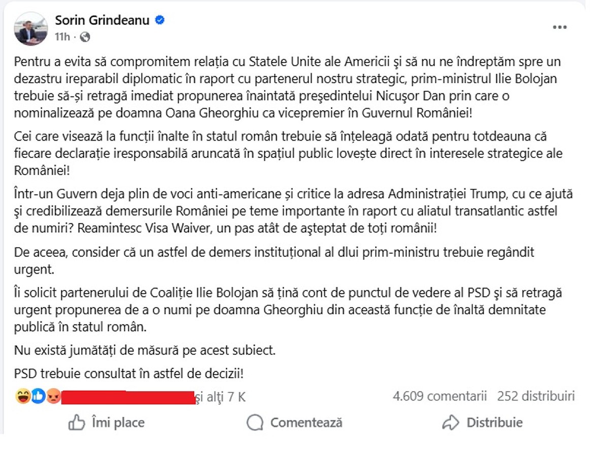 Oana Gheorghiu, propunerea premierului Ilie Bolojan de vicepremier, a transmis, într-un mesaj postat pe pagina sa de Facebook, că postarea sa mai veche „incriminată” de Sorin Grindeanu a fost făcută „într-un context emoțional foarte încărcat” și că nu a fost singura tulburată de acel eveniment, respectiv discuția aprinsă din Birou Oval dintre Donald Trump și JD Vance, pe de o partea, și liderul ucrainean Volodimir Zelenski, pe de alta.