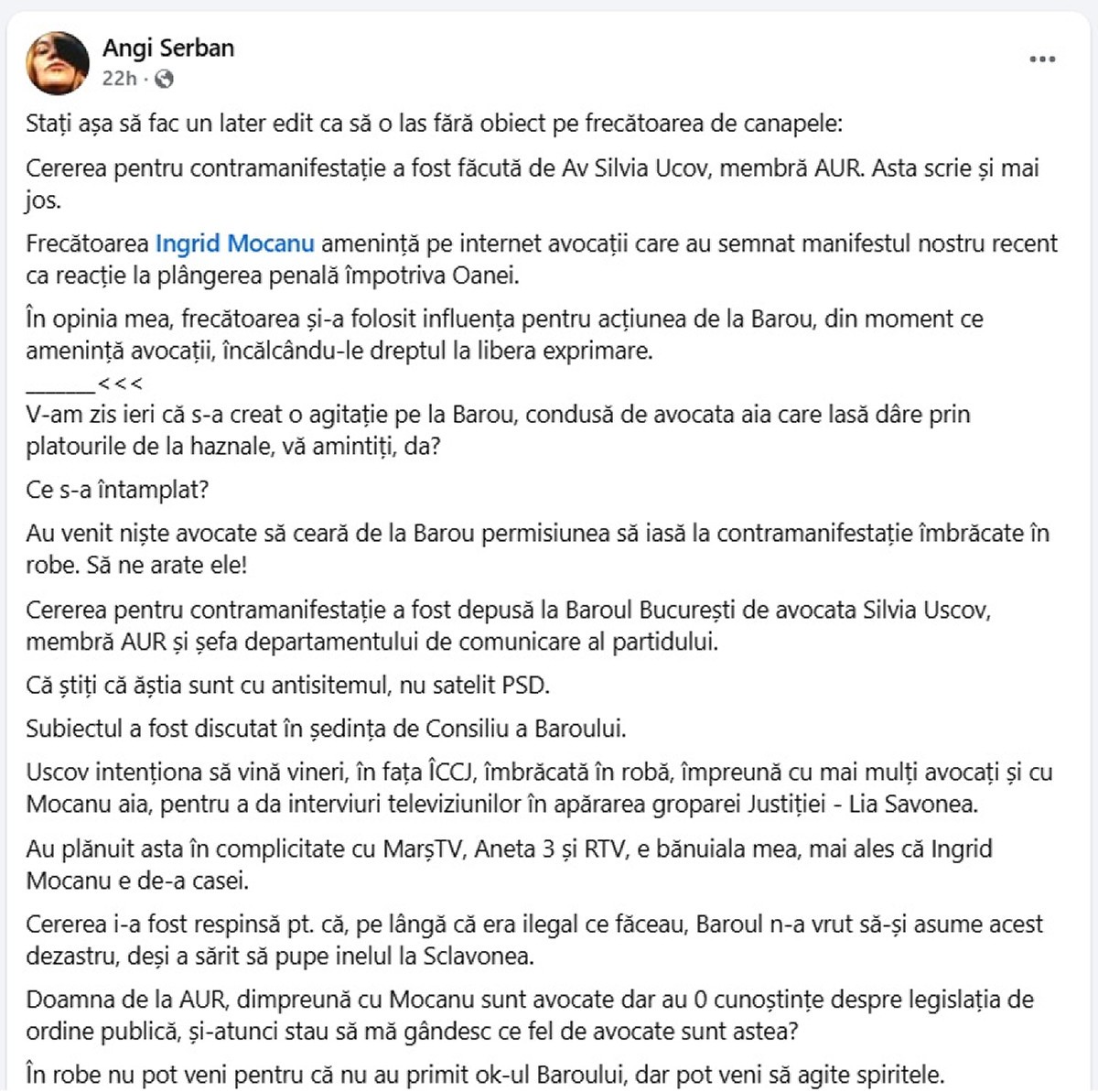 Știrea inițială. Potrivit activistei civice Angi Șerban, controversata avocată Ingrid Mocanu, fostă invitată de bază în studiourile Antenei 3 pentru a o denigra pe Laura Codruța Kovesi în vremea șefiei acesteia la DNA, devenită între timp una dintre invitatele predilecte ale propagandistei Anca Alexandrescu la Realitatea și reprezentantă a formațiunii AUR în Biroul Electoral Central, ar fi intenționat să organizeze o manifestație de susținere a Liei Savonea, în aceeași zi și același loc cu protestul anunțat pentru vineri, 14 noiembrie, în care ar urma să se solicite revocarea președintei controversate a ÎCCJ. (Mențiune: așa cum am afirmat mai sus, în dreptul la replică, avocata Mocanu susține că nu este implicată în ceea ce ar putea fi o contramanifestație)