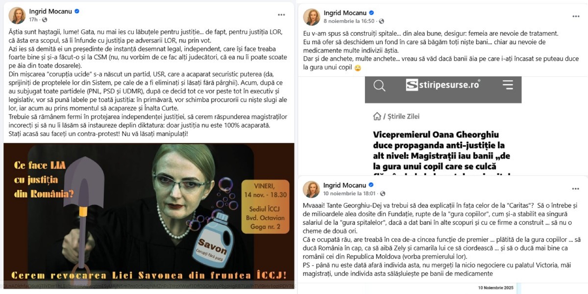 Context 2. Ingrid Mocanu are, în ultimele zile, postări extrem de critice la adresa declarațiilor făcute de vicepremierul Oana Gheorghiu cu privire la pensiile magistraților și la sentințele favorabile pe care și le dau aceștia în spețele în care solicită drepturi salariale restante de zeci de mii de euro. Vezi captura de mai jos care surprinde doar o mică parte din comentariile caustice ale avocatei AUR.